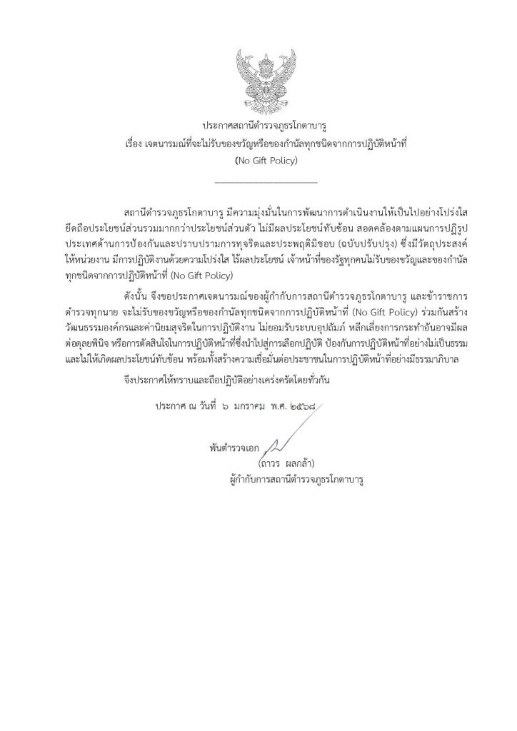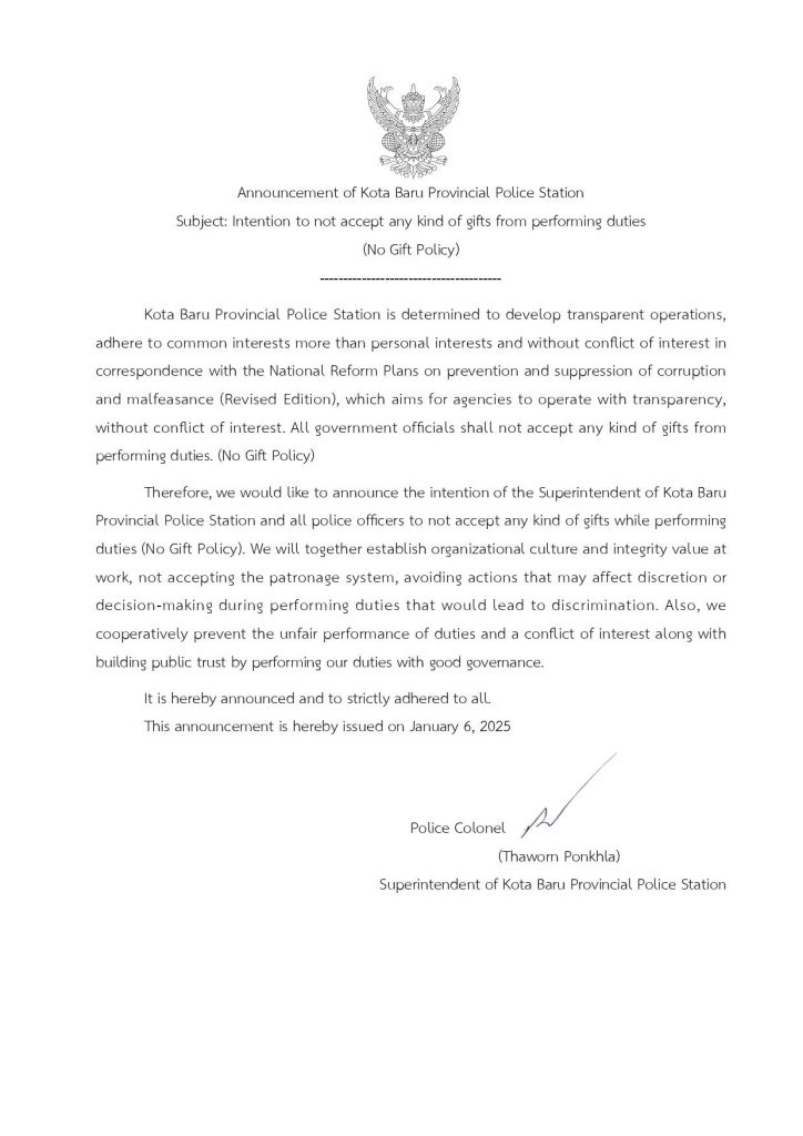 วันที่ ๑๕ ธันวาคม ๒๕๖๘ เวลา ๑๑.๓๐ น. ภายใต้การอำนวยการของ พ.ต.อ.ถาวร ผลกล้า ผกก.สภ.โกตาบารู(โกตา๑)ม