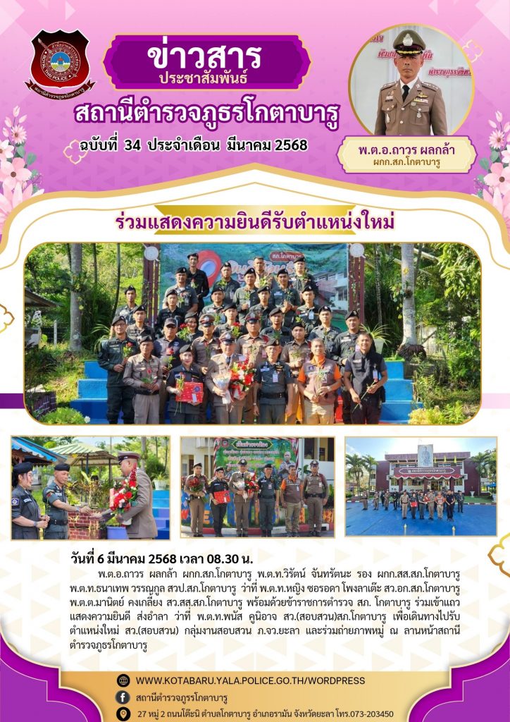 พ.ต.อ.ถาวร ผลกล้า ผกก.สภ.โกตาบารู พ.ต.ท.วิรัตน์ จันทรัตนะ รอง ผกก.สส.สภ.โกตาบารู พ.ต.ท.ธนาเทพ วรรณกูล สวป.สภ.โกตาบารู ว่าที่ พ.ต.ท.หญิง ซอรอดา โพงลาเต๊ะ สว.อก.สภ.โกตาบารู พ.ต.ต.มานิตย์ คงเกลี้ยง สว.สส.สภ.โกตาบารู พร้อมด้วยข้าราชการตำรวจ สภ. โกตาบารู ร่วมเข้าแถวแสดงความยินดี ส่งอำลา ว่าที่ พ.ต.ท.พนัส คูนิอาจ สว.(สอบสวน)สภ.โกตาบารู เพื่อเดินทางไปรับตำแหน่งใหม่ สว.(สอบสวน) กลุ่มงานสอบสวน ภ.จว.ยะลา และร่วมถ่ายภาพหมู่ ณ ลานหน้าสถานีตำรวจภูธรโกตาบารู