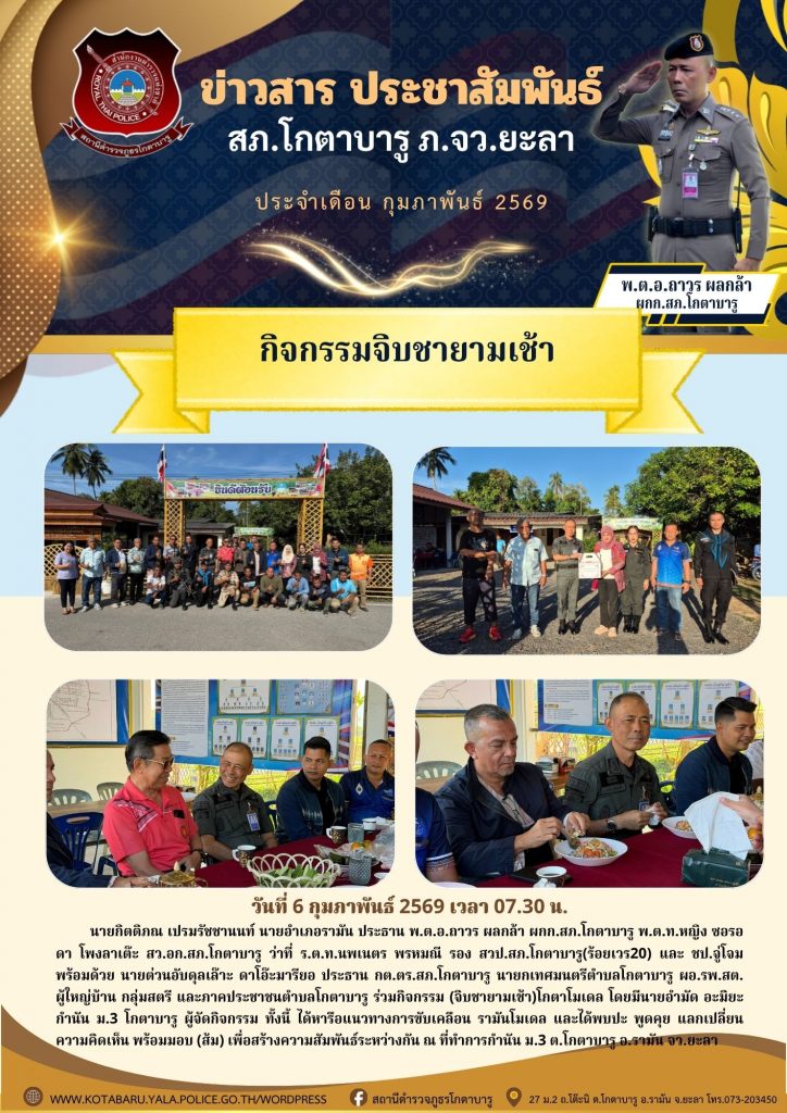 นายกิตติภณ เปรมรัชชานนท์ นายอำเภอรามัน ประธาน พ.ต.อ.ถาวร ผลกล้า ผกก.สภ.โกตาบารู พ.ต.ท.หญิง ซอรอดา โพงลาเต๊ะ สว.อก.สภ.โกตาบารู ว่าที่ ร.ต.ท.นพเนตร พรหมณี รอง สวป.สภ.โกตาบารู(ร้อยเวร20) และ ชป.จู่โจม พร้อมด้วย นายต่วนอับดุลเล๊าะ ดาโอ๊ะมารียอ ประธาน กต.ตร.สภ.โกตาบารู นายกเทศมนตรีตำบลโกตาบารู ผอ.รพ.สต. ผู้ใหญ่บ้าน กลุ่มสตรี และภาคประชาชนตำบลโกตาบารู ร่วมกิจกรรม (จิบชายามเช้า)โกตาโมเดล โดยมีนายอำมัด อะมิยะ กำนัน ม.3 โกตาบารู ผู้จัดกิจกรรม ทั้งนี้ ได้หารือแนวทางการขับเคลือน รามันโมเดล และได้พบปะ พูดคุย แลกเปลี่ยนความคิดเห็น พร้อมมอบ (ส้ม) เพื่อสร้างความสัมพันธ์ระหว่างกัน ณ ที่ทำการกำนัน ม.3 ต.โกตาบารู อ.รามัน จว.ยะลา