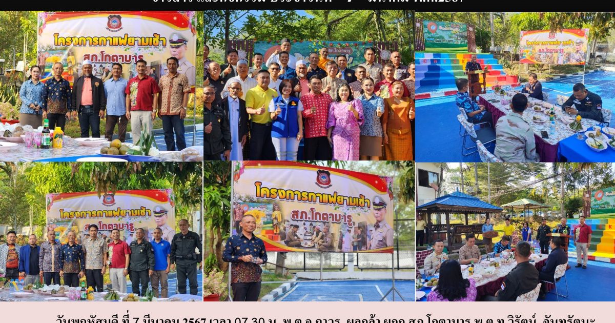 วันพฤหัสบดี ที่ 7 มีนาคม 2567 เวลา 07.30 น. พ.ต.อ.ถาวร ผลกล้า ผกก.สภ.โกตาบารู พ.ต.ท.วิรัตน์ จันทรัตนะ รอง ผกก.สส.สภ.โกตาบารู พ.ต.ท.บุญเลิศ นกเกตุ รอง ผกก.ป.สภ.โกตาบารู พ.ต.ต.มานิตย์ คงเกลี้ยง สว.สส.สภ.โกตาบารู พ.ต.ต.พนัส คูนิอาจ สว.(สอบสวน)สภ.โกตาบารู พ.ต.ต.หญิงซอรอดา โพงลาเต๊ะ สว.อก.สภ.โกตาบารู ให้การต้อนรับหัวหน้าส่วนราชการ ผู้นำท้องถิ่น ผู้นำศาสนา และประชาชนในพื้นที่ กิจกรรมพบปะกาแฟยามเช้า ตามโครงการกาแฟยามเช้า สภ.โกตาบารู เพื่อสร้างความสัมพันธ์ที่ดีระหว่างส่วนราชการ ผู้นำท้องถิ่น ผู้นำศาสนา และประชาชนในพื้นที่ตำบลโกตาบารู อำเภอรามัน จังหวัดยะลา ได้พูดคุยแลกเปลี่ยนความคิดเห็น เพื่อสร้างความสัมพันธ์ไมตรีอันดีงาม