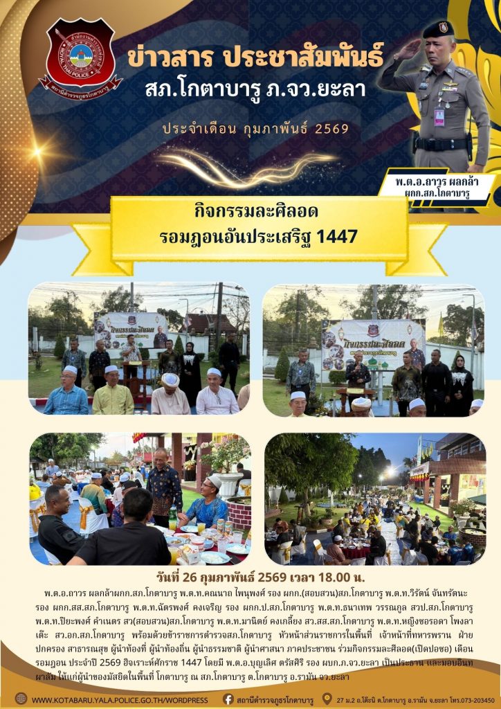 พ.ต.อ.ถาวร ผลกล้าผกก.สภ.โกตาบารู พ.ต.ท.คณนาถ ไพนุพงศ์ รอง ผกก.(สอบสวน)สภ.โกตาบารู พ.ต.ท.วิรัตน์ จันทรัตนะ รอง ผกก.สส.สภ.โกตาบารู พ.ต.ท.ฉัตรพงศ์ คงเจริญ รอง ผกก.ป.สภ.โกตาบารู พ.ต.ท.ธนาเทพ วรรณกูล สวป.สภ.โกตาบารู พ.ต.ท.ปิยะพงศ์ คำเนตร สว(สอบสวน)สภ.โกตาบารู พ.ต.ท.มานิตย์ คงเกลี้ยง สว.สส.สภ.โกตาบารู พ.ต.ท.หญิงซอรอดา โพงลาเต๊ะ สว.อก.สภ.โกตาบารู พร้อมด้วยข้าราชการตำรวจสภ.โกตาบารู หัวหน้าส่วนราชการในพื้นที่ เจ้าหน้าที่ทหารพราน ฝ่ายปกครอง สาธารณสุข ผู้นำท้องที่ ผู้นำท้องถิ่น ผู้นำธรรมชาติ ผู้นำศาสนา ภาคประชาชน ร่วมกิจกรรมละศีลอด(เปิดปอซอ) เดือนรอมฎอน ประจำปี 2569 ฮิจเราะห์ศักราช 1447 โดยมี พ.ต.อ.บุญเลิศ ตรัสศิริ รอง ผบก.ภ.จว.ยะลา เป็นประธาน และมอบอินทผาลัม ให้แก่ผู้นำของมัสยิดในพื้นที่ โกตาบารู ณ สภ.โกตาบารู ต.โกตาบารู อ.รามัน จว.ยะลา