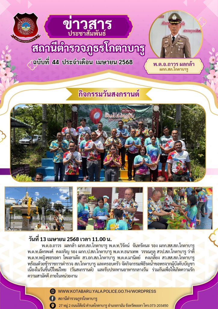 พ.ต.อ.ถาวร ผลกล้า ผกก.สภ.โกตาบารู พ.ต.ท.วิรัตน์ จันทรัตนะ รอง ผกก.สส.สภ.โกตาบารู พ.ต.ท.ฉัตรพงศ์ คงเจริญ รอง ผกก.ป.สภ.โกตาบารู พ.ต.ท.ธนาเทพ วรรณกูล สวป.สภ.โกตาบารู ว่าที่ พ.ต.ท.หญิงซอรอดา โพงลาเต๊ะสว.อก.สภ.โกตาบารู พ.ต.ต.มานิตย์ คงเกลี้ยง สว.สส.สภ.โกตาบารู พร้อมด้วยข้าราชการตำรวจ สภ.โกตาบารู และครอบครัว จัดกิจกรรมพิธีรดน้ำขอพรจากผู้บังคับบัญชา เนื่องในวันขึ้นปีใหม่ไทย (วันสงกรานต์) และรับประทานอาหารกลางวัน ร่วมกัน เพื่อให้เกิดความรัก ความสามัคคี ภายในหน่วยงาน
