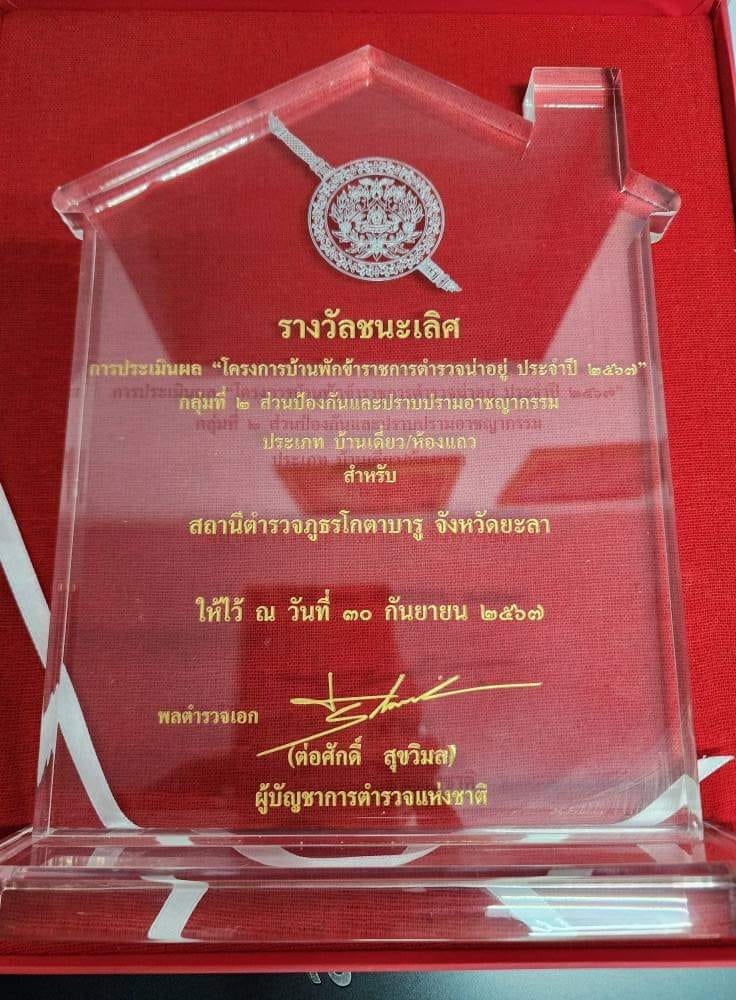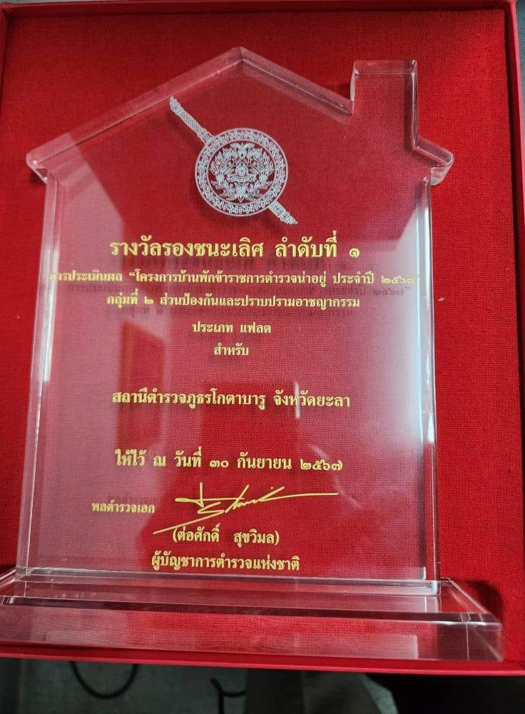 2.) รางวัลรองชนะเลิศ อันดับที่ 1 โล่ประกาศเกียรติคุณ ตามโครงการบ้านพักข้าราชการตำรวจน่าอยู่ ประจำปี 2567 ประเภท (แฟลต) ณ ห้องประชุมยะลารวมใจ ศปก.ตร.สน. อ.เมืองยะลา จ.ยะลา