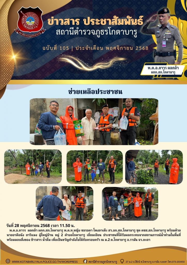 ช่วยเหลือประชาชน 30 พฤศจิกายน 2568 โดย หัสซาน สะแลมะ / ข่าวภารกิจผู้บังคับบัญชา วันที่ 28 พฤศจิกายน 2568 เวลา 11.50 น. พ.ต.อ.ถาวร ผลกล้า ผกก.สภ.โกตาบารู พ.ต.ท.หญิง ซอรอดา โพงลาเต๊ะ สว.อก.สภ.โกตาบารู ชุด ตชส.สภ.โกตาบารูพร้อมด้วย นายอาดือนัง ยาริแมง ผู้ใหญ่บ้าน หมู่ 2 ตำบลโกตาบารู เยี่ยมเยียน ประชาชนที่ได้รับผลกระทบจากสถานการณ์น้ำท่วมในพื้นที่ พร้อมมอบสิ่งของ ข้าวสาร น้ำดื่ม เพื่อเป็นขวัญกำลังใจให้กับครอบครัว ณ ม.2 ต.โกตาบารู อ.รามัน จว.ยะลา Facebook iconFacebookTwitter iconTwitterLINE iconLine