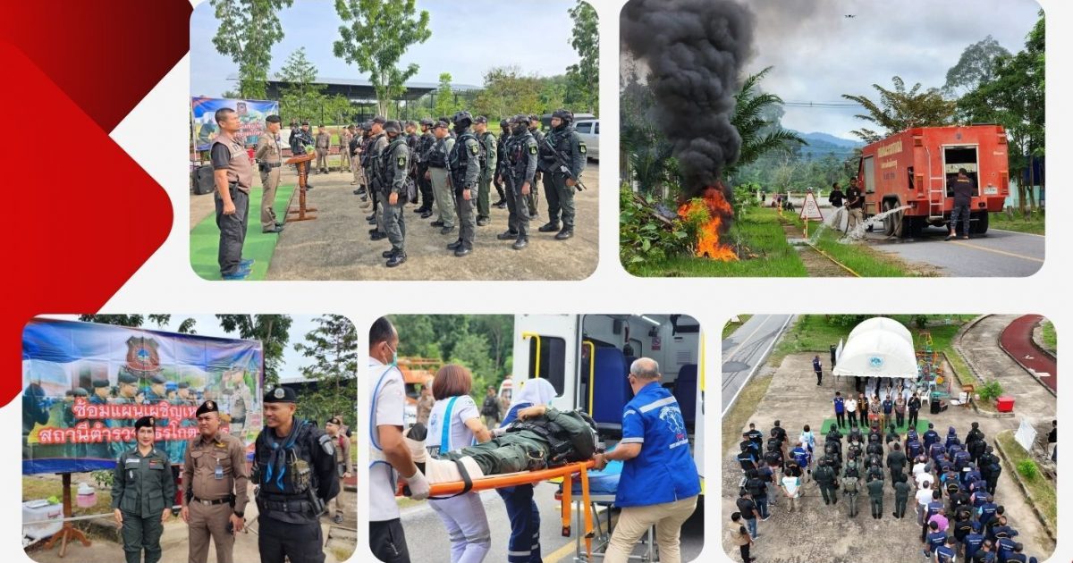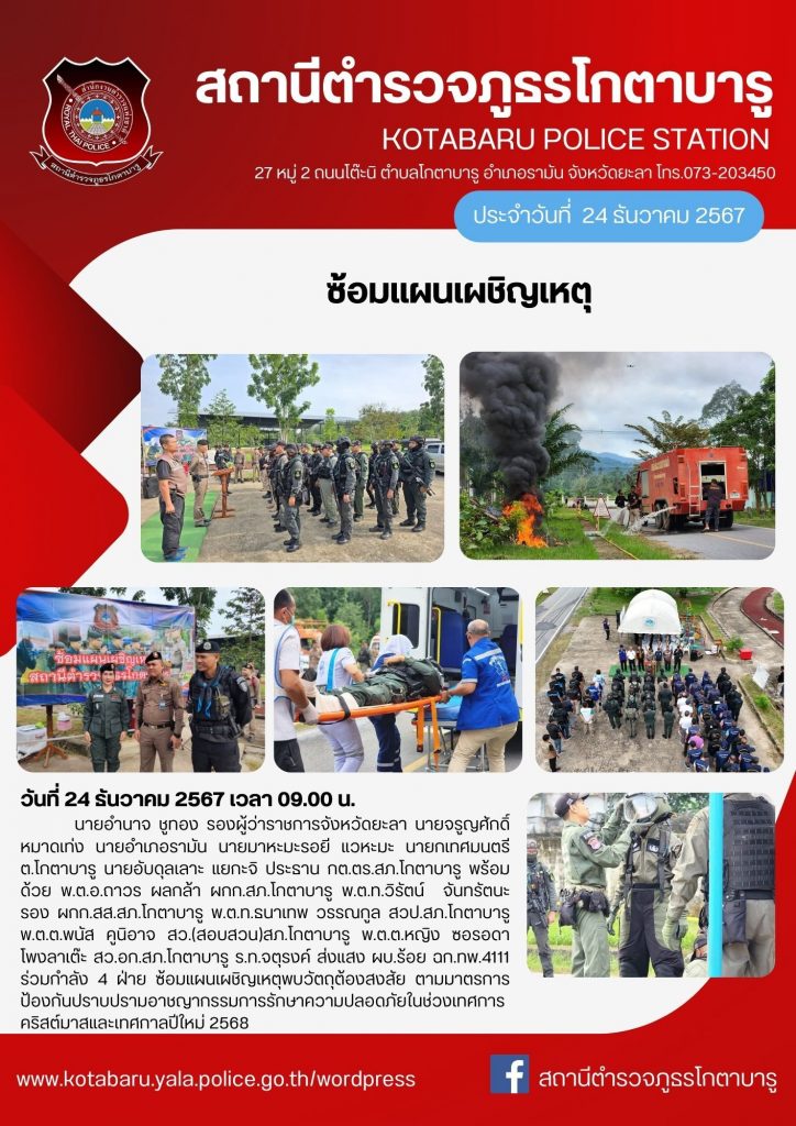 นายอำนาจ ชูทอง รองผู้ว่าราชการจังหวัดยะลา นายจรูญศักดิ์ หมาดเท่ง นายอำเภอรามัน นายมาหะมะรอยี แวหะมะ นายกเทศมนตรี ต.โกตาบารู นายอับดุลเลาะ แยกะจิ ประธาน กต.ตร.สภ.โกตาบารู พร้อมด้วย พ.ต.อ.ถาวร ผลกล้า ผกก.สภ.โกตาบารู พ.ต.ท.วิรัตน์ จันทรัตนะ รอง ผกก.สส.สภ.โกตาบารู พ.ต.ท.ธนาเทพ วรรณกูล สวป.สภ.โกตาบารู พ.ต.ต.พนัส คูนิอาจ สว.(สอบสวน)สภ.โกตาบารูพ.ต.ต.หญิง ซอรอดา โพงลาเต๊ะ สว.อก.สภ.โกตาบารู ร.ท.จตุรงค์ ส่งแสง ผบ.ร้อย ฉก.ทพ.4111 ร่วมกำลัง 4 ฝ่าย ซ้อมแผนเผชิญเหตุพบวัตถุต้องสงสัย ตามมาตรการป้องกันปราบปรามอาชญากรรม การรักษาความปลอดภัยในช่วงเทศกาลคริสต์มาสและเทศกาลปีใหม่ 2568