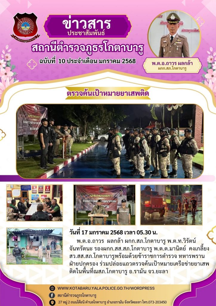 พ.ต.อ.ถาวร ผลกล้าผกก.สภ.โกตาบารู พ.ต.ท.วิรัตน์ จันทรัตนะ รองผกก.สส.สภ.โกตาบารู พ.ต.ต.มานิตย์ คงเกลี้ยง สว.สส.สภ.โกตาบารูพร้อมด้วยข้าราชการตำรวจ ทหารพราน ฝ่ายปกครอง ร่วมปล่อยแถวตรวจค้นเป้าหมายเครือข่ายยาเสพติดในพื้นที่ณ สภ.โกตาบารู อ.รามัน จว.ยะลา