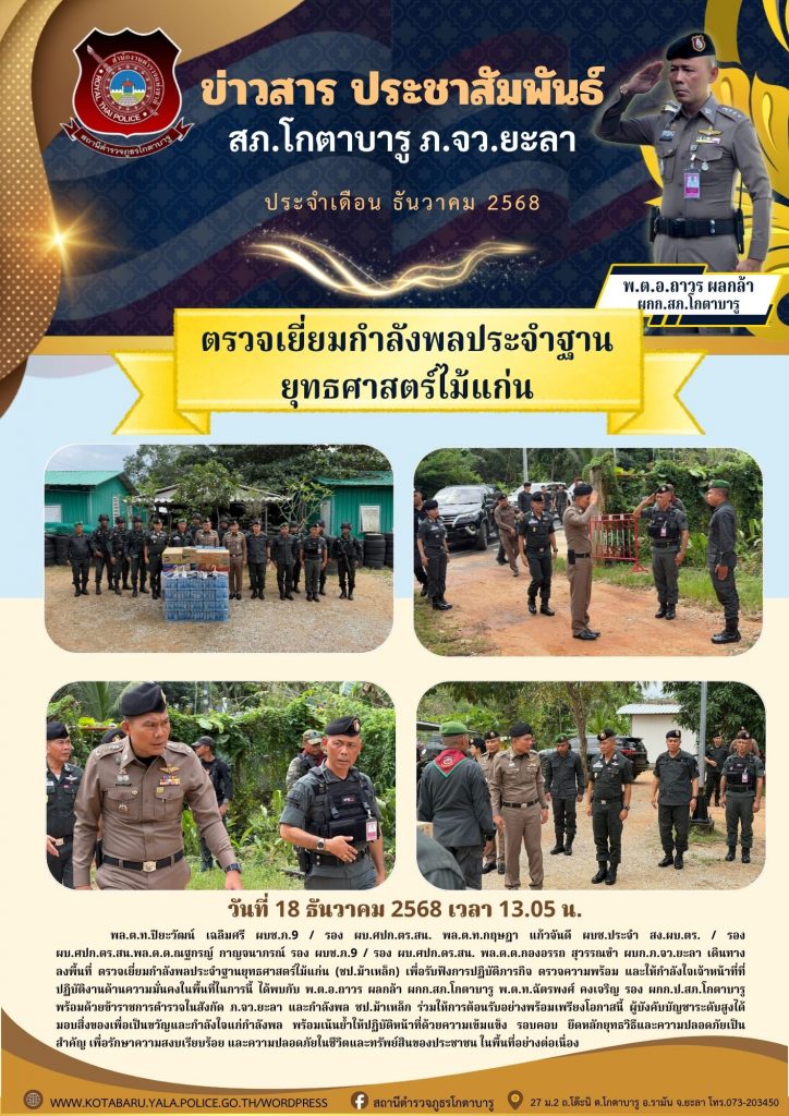 พล.ต.ท.ปิยะวัฒน์ เฉลิมศรี ผบช.ภ.9 / รอง ผบ.ศปก.ตร.สน. พล.ต.ท.กฤษฎา แก้วจันดี ผบช.ประจำ สง.ผบ.ตร. / รอง ผบ.ศปก.ตร.สน.พล.ต.ต.ณฐกรญ์ กาญจนาภรณ์ รอง ผบช.ภ.9 / รอง ผบ.ศปก.ตร.สน. พล.ต.ต.กองอรรถ สุวรรณขำ ผบก.ภ.จว.ยะลา เดินทางลงพื้นที่ ตรวจเยี่ยมกำลังพลประจำฐานยุทธศาสตร์ไม้แก่น (ชป.ม้าเหล็ก) เพื่อรับฟังการปฏิบัติภารกิจ ตรวจความพร้อม และให้กำลังใจเจ้าหน้าที่ที่ปฏิบัติงานด้านความมั่นคงในพื้นที่ในการนี้ ได้พบกับ พ.ต.อ.ถาวร ผลกล้า ผกก.สภ.โกตาบารู พ.ต.ท.ฉัตรพงศ์ คงเจริญ รอง ผกก.ป.สภ.โกตาบารู พร้อมด้วยข้าราชการตำรวจในสังกัด ภ.จว.ยะลา และกำลังพล ชป.ม้าเหล็ก ร่วมให้การต้อนรับอย่างพร้อมเพรียงโอกาสนี้ ผู้บังคับบัญชาระดับสูงได้มอบสิ่งของเพื่อเป็นขวัญและกำลังใจแก่กำลังพล พร้อมเน้นย้ำให้ปฏิบัติหน้าที่ด้วยความเข้มแข็ง รอบคอบ ยึดหลักยุทธวิธีและความปลอดภัยเป็นสำคัญ เพื่อรักษาความสงบเรียบร้อย และความปลอดภัยในชีวิตและทรัพย์สินของประชาชน ในพื้นที่อย่างต่อเนื่อง