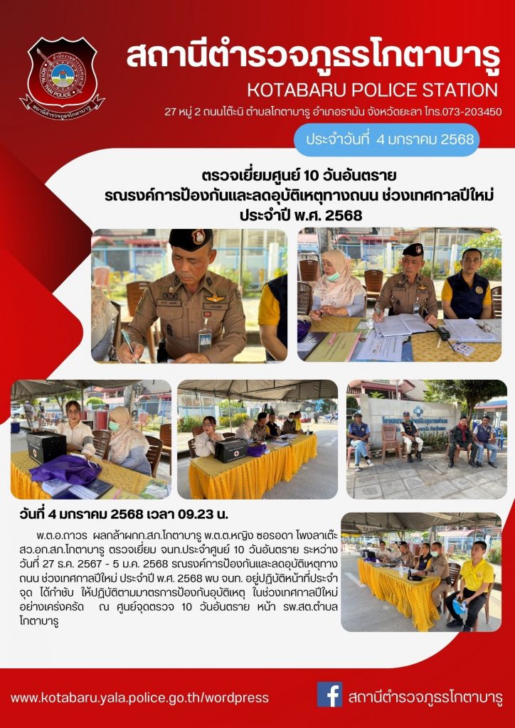 พ.ต.อ.ถาวร ผลกล้า ผกก.สภ.โกตาบารู พ.ต.ต.หญิง ซอรอดา โพงลาเต๊ะ สว.อก.สภ.โกตาบารู ตรวจเยี่ยม จนท.ประจำศูนย์ 10 วันอันตราย ระหว่างวันที่ 27 ธ.ค. 2567 – 5 ม.ค. 2568 รณรงค์การป้องกันและลดอุบัติเหตุทางถนน ช่วงเทศกาลปีใหม่ ประจำปี พ.ศ. 2568 พบ จนท. อยู่ปฏิบัติหน้าที่ประจำจุด ได้กำชับ ให้ปฏิบัติตามมาตรการป้องกันอุบัติเหตุ ในช่วงเทศกาลปีใหม่ อย่างเคร่งครัด ณ ศูนย์จุดตรวจ 10 วันอันตราย หน้า รพ.สต.ตำบลโกตาบารู