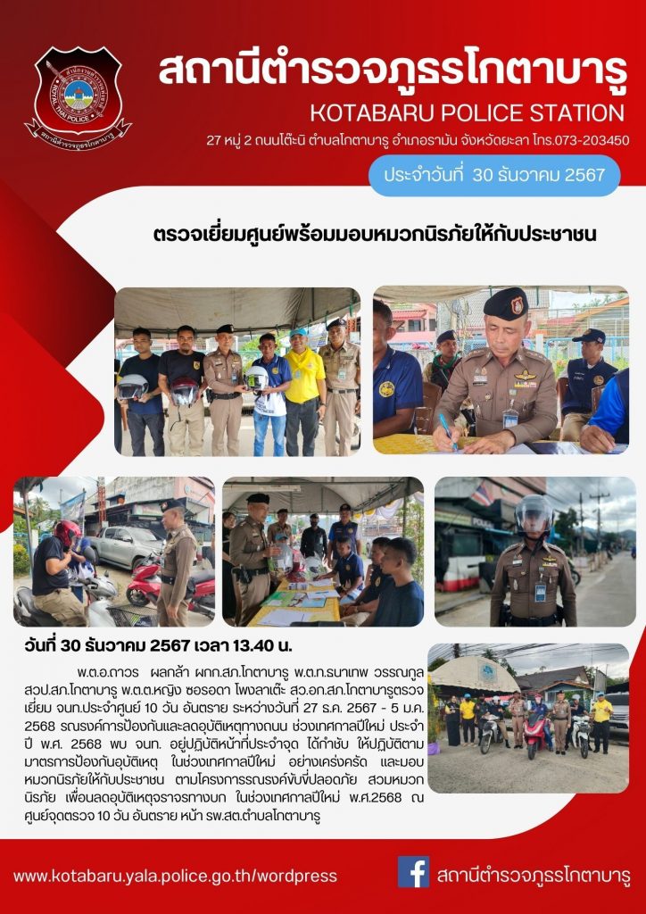 พ.ต.อ.ถาวร ผลกล้า ผกก.สภ.โกตาบารู พ.ต.ท.ธนาเทพ วรรณกูล สวป.สภ.โกตาบารู พ.ต.ต.หญิง ซอรอดา โพงลาเต๊ะสว.อก.สภ.โกตาบารู ตรวจเยี่ยม จนท.ประจำศูนย์ 10 วัน อันตราย ระหว่างวันที่ 27 ธ.ค. 2567 – 5 ม.ค. 2568 รณรงค์การป้องกันและลดอุบัติเหตุทางถนน ช่วงเทศกาลปีใหม่ ประจำปี พ.ศ. 2568 พบ จนท. อยู่ปฏิบัติหน้าที่ประจำจุด ได้กำชับ ให้ปฏิบัติตามมาตรการป้องกันอุบัติเหตุ ในช่วงเทศกาลปีใหม่ อย่างเคร่งครัด และมอบ หมวกนิรภัยให้กับประชาชน ตามโครงการรณรงค์ขับขี่ปลอดภัย สวมหมวกนิรภัย เพื่อนลดอุบัติเหตุจราจรทางบก ในช่วงเทศกาลปีใหม่ พ.ศ.2568 ณ ศูนย์จุดตรวจ 10 วัน อันตราย หน้า รพ.สต.ตำบลโกตาบารู