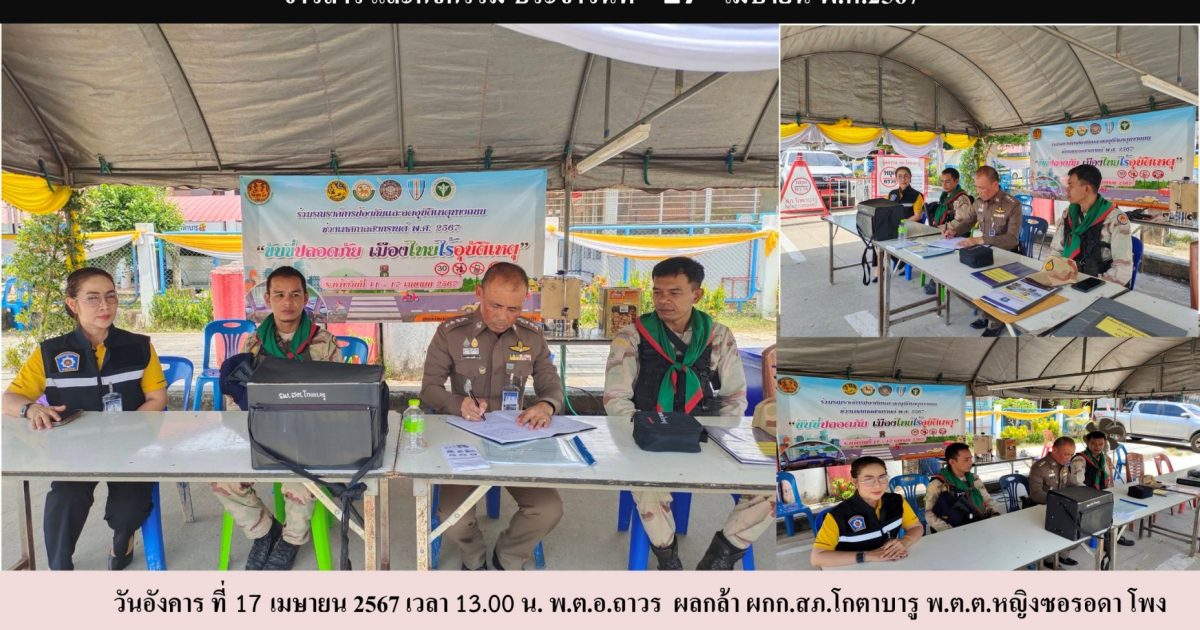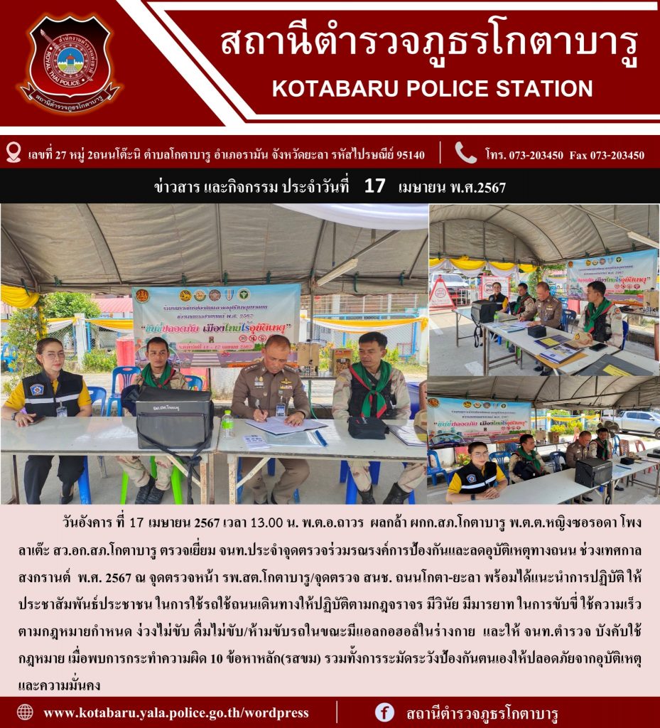 วันอังคาร ที่ 17 เมษายน 2567 เวลา 13.00 น. พ.ต.อ.ถาวร ผลกล้า ผกก.สภ.โกตาบารู พ.ต.ต.หญิงซอรอดา โพง ลาเต๊ะ สว.อก.สภ.โกตาบารู ตรวจเยี่ยม จนท.ประจำจุดตรวจร่วมรณรงค์การป้องกันและลดอุบัติเหตุทางถนน ช่วงเทศกาล สงกรานต์ พ.ศ. 2567 ณ จุดตรวจหน้า รพ.สต.โกตาบารู/จุดตรวจ สนช. ถนนโกตา-ยะลา พร้อมได้แนะนำการปฏิบัติให้ ประชาสัมพันธ์ประชาชน ในการใช้รถใช้ถนนเดินทางให้ปฏิบัติตามกฎจราจร มีวินัย มีมารยาท ในการขับขี่ใช้ความเร็ว ตามกฎหมายกำหนด ง่วงไม่ขับ ดื่มไม่ขับ/ห้ามขับรถในขณะมีแอลกอฮอล์ในร่างกาย และให้ จนท.ตำรวจ บังคับใช้ กฎหมาย เมื่อพบการกระทำความผิด 10 ข้อหาหลัก(รสขม) รวมทั้งการระมัดระวังป้องกันตนเองให้ปลอดภัยจากอุบัติเหตุ และความมั่นคง