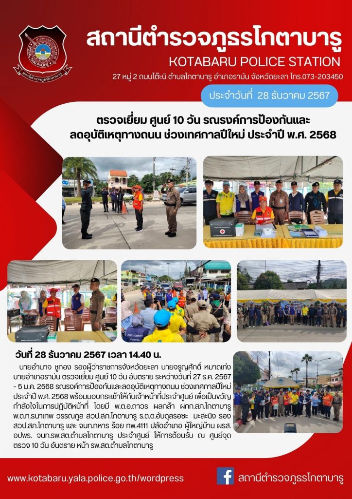 นายอำนาจ ชูทอง รองผู้ว่าราชการจังหวัดยะลา นายจรูญศักดิ์ หมาดเท่ง นายอำเภอรามัน ตรวจเยี่ยม ศูนย์ 10 วัน อันตราย ระหว่างวันที่ 27 ธ.ค. 2567 – 5 ม.ค. 2568 รณรงค์การป้องกันและลดอุบัติเหตุทางถนน ช่วงเทศกาลปีใหม่ ประจำปี พ.ศ. 2568 พร้อมมอบกระเช้าให้กับเจ้าหน้าที่ประจำศูนย์ เพื่อเป็นขวัญกำลังใจในการปฏิบัติหน้าที่ โดยมี พ.ต.อ.ถาวร ผลกล้า ผกก.สภ.โกตาบารู พ.ต.ท.ธนาเทพ วรรณกูล สวป.สภ.โกตาบารู ร.ต.ต.อับดุลรอซะ มะสะนิง รอง สวป.สภ.โกตาบารู และ จนท.ทหาร ร้อย ทพ.4111 ปลัดอำเภอ ผู้ใหญ่บ้าน ผรส. อปพร. จนท.รพ.สต.ตำบลโกตาบารู ประจำศูนย์ ให้การต้อนรับ ณ ศูนย์จุดตรวจ 10 วัน อันตราย หน้า รพ.สต.ตำบลโกตาบารู
