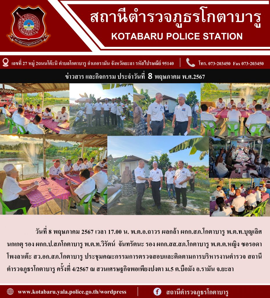 วันที่ 8 พฤษภาคม 2567 เวลา 17.00 น. พ.ต.อ.ถาวร ผลกล้า ผกก.สภ.โกตาบารู พ.ต.ท.บุญเลิศ นกเกตุ รอง ผกก.ป.สภโกตาบารู พ.ต.ท.วิรัตน์ จันทรัตนะ รอง ผกก.สส.สภ.โกตาบารู พ.ต.ต.หญิง ซอรอดา โพงลาเต๊ะ สว.อก.สภ.โกตาบารู ประชุมคณะกรรมการตรวจสอบและติดตามการบริหารงานตำรวจ สถานีตำรวจภูธรโกตาบารู ครั้งที่ 4/2567 ณ สวนเศรษฐกิจพอเพียงปงตา ม.5 ต.บือมัง อ.รามัน จ.ยะลา