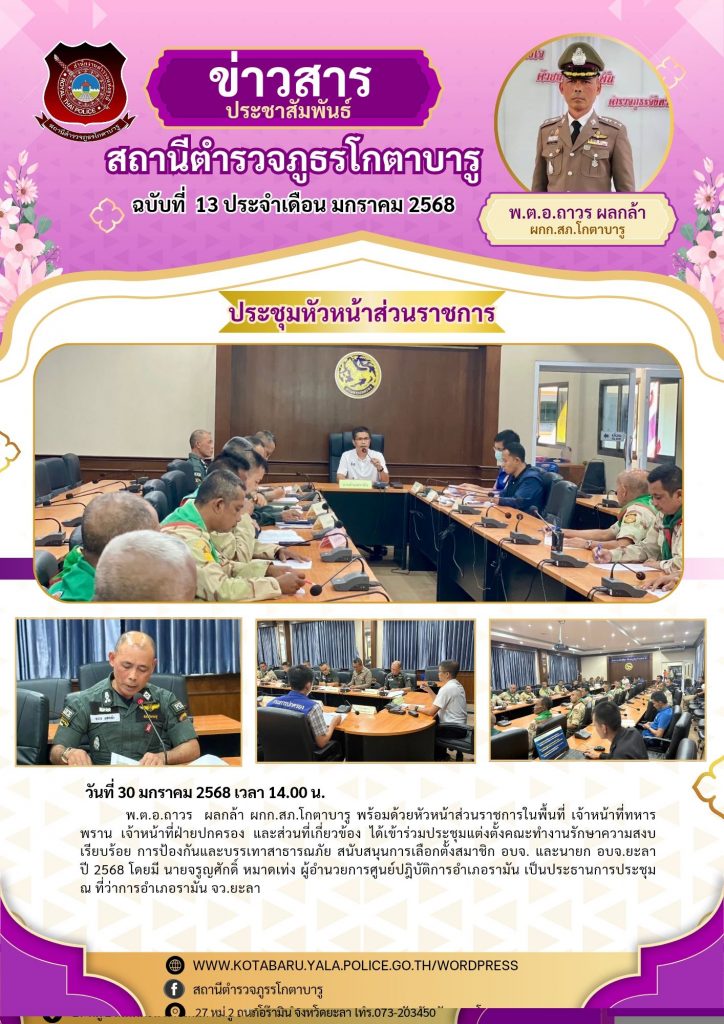 พ.ต.อ.ถาวร ผลกล้า ผกก.สภ.โกตาบารู พร้อมด้วยหัวหน้าส่วนราชการในพื้นที่ เจ้าหน้าที่ทหารพราน เจ้าหน้าที่ฝ่ายปกครอง และส่วนที่เกี่ยวข้อง ได้เข้าร่วมประชุมแต่งตั้งคณะทำงานรักษาความสงบเรียบร้อย การป้องกันและบรรเทาสาธารณภัย สนับสนุนการเลือกตั้งสมาชิก อบจ. และนายก อบจ.ยะลา ปี 2568 โดยมี นายจรูญศักดิ์ หมาดเท่ง ผู้อำนวยการศูนย์ปฎิบัติการอำเภอรามัน เป็นประธานการประชุม ณ ที่ว่าการอำเภอรามัน จว.ยะลา