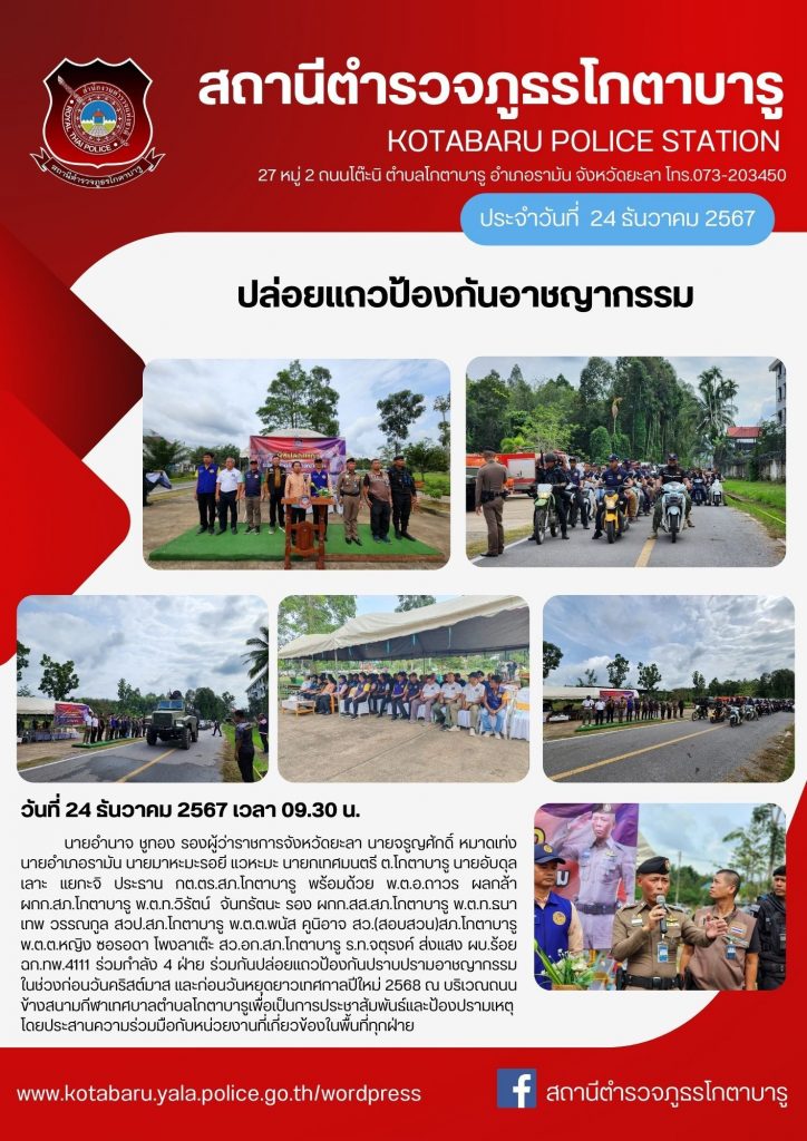 นายอำนาจ ชูทอง รองผู้ว่าราชการจังหวัดยะลา นายจรูญศักดิ์ หมาดเท่ง นายอำเภอรามัน นายมาหะมะรอยี แวหะมะ นายกเทศมนตรี ต.โกตาบารู นายอับดุลเลาะ แยกะจิ ประธาน กต.ตร.สภ.โกตาบารู พร้อมด้วย พ.ต.อ.ถาวร ผลกล้า ผกก.สภ.โกตาบารู พ.ต.ท.วิรัตน์ จันทรัตนะ รอง ผกก.สส.สภ.โกตาบารู พ.ต.ท.ธนาเทพ วรรณกูล สวป.สภ.โกตาบารู พ.ต.ต.พนัส คูนิอาจ สว.(สอบสวน)สภ.โกตาบารู พ.ต.ต.หญิง ซอรอดา โพงลาเต๊ะ สว.อก.สภ.โกตาบารู ร.ท.จตุรงค์ ส่งแสง ผบ.ร้อย ฉก.ทพ.4111 ร่วมกำลัง 4 ฝ่าย ร่วมกันปล่อยแถวป้องกันปราบปรามอาชญากรรม ในช่วงก่อนวันคริสต์มาส และก่อนวันหยุดยาวเทศกาลปีใหม่ 2568 ณ บริเวณถนนข้างสนามกีฬาเทศบาลตำบลโกตาบารู เพื่อเป็นการประชาสัมพันธ์และป้องปรามเหตุ โดยประสานความร่วมมือกับหน่วยงานที่เกี่ยวข้องในพื้นที่ทุกฝ่าย