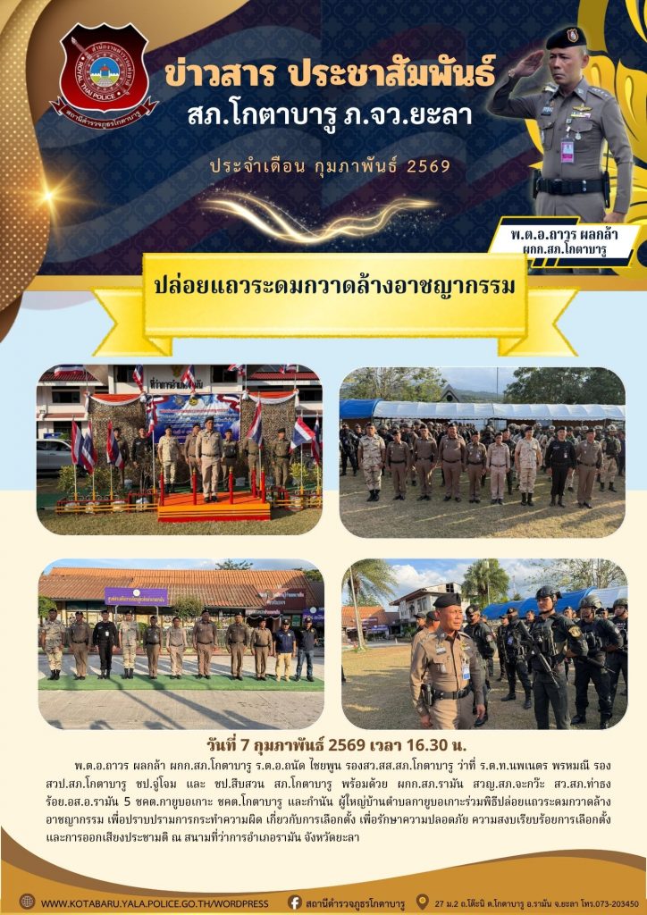 ปล่อยแถวระดมกวาดล้างอาชญากรรม 10 กุมภาพันธ์ 2569 โดย หัสซาน สะแลมะ / ข่าวภารกิจผู้บังคับบัญชา วันที่ 7 กุมภาพันธ์ 2569 เวลา 16.30 น. พ.ต.อ.ถาวร ผลกล้า ผกก.สภ.โกตาบารู ร.ต.อ.ถนัด ไชยพูน รองสว.สส.สภ.โกตาบารู ว่าที่ ร.ต.ท.นพเนตร พรหมณี รอง สวป.สภ.โกตาบารู ชป.จู่โจม และ ชป.สืบสวน สภ.โกตาบารู พร้อมด้วย ผกก.สภ.รามัน สวญ.สภ.จะกว๊ะ สว.สภ.ท่าธง ร้อย.อส.อ.รามัน 5 ชคต.กายูบอเกาะ ชคต.โกตาบารู และกำนัน ผู้ใหญ่บ้านตำบลกายูบอเกาะร่วมพิธีปล่อยแถวระดมกวาดล้างอาชญากรรม เพื่อปราบปรามการกระทำความผิด เกี่ยวกับการเลือกตั้ง เพื่อรักษาความปลอดภัย ความสงบเรียบร้อยการเลือกตั้ง และการออกเสียงประชามติ ณ สนามที่ว่าการอำเภอรามัน จังหวัดยะลา Facebook iconFacebookTwitter iconTwitterLINE iconLine