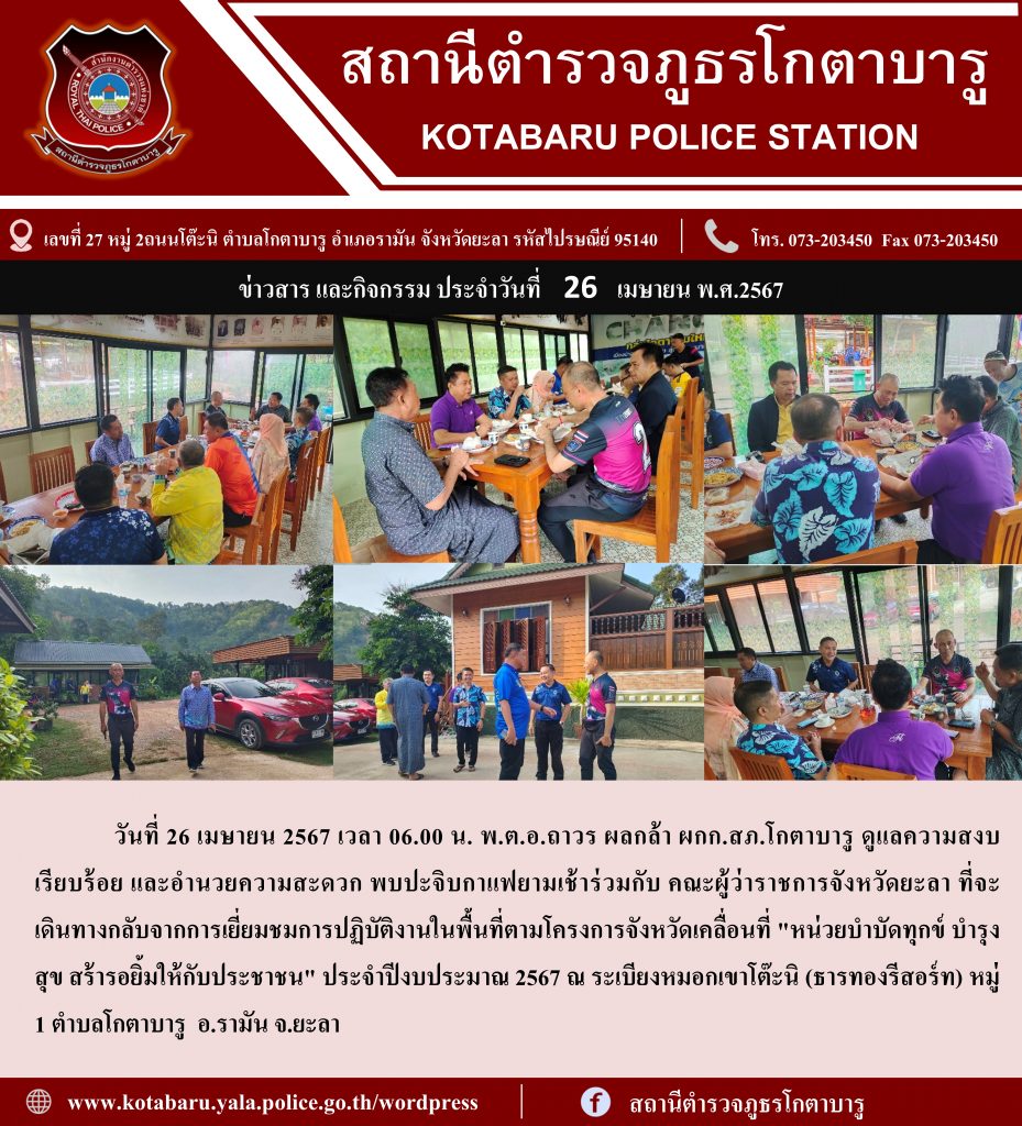 พบปะจิบกาแฟยามเช้า 26 เมษายน 2567 โดย หัสซาน สะแลมะ / ข่าวภารกิจผู้บังคับบัญชา วันที่ 26 เมษายน 2567 เวลา 06.00 น. พ.ต.อ.ถาวร ผลกล้า ผกก.สภ.โกตาบารู ดูแลความสงบ เรียบร้อย และอำนวยความสะดวก พบปะจิบกาแฟยามเช้าร่วมกับ คณะผู้ว่าราชการจังหวัดยะลา ที่จะ เดินทางกลับจากการเยี่ยมชมการปฏิบัติงานในพื้นที่ตามโครงการจังหวัดเคลื่อนที่ “หน่วยบำบัดทุกข์ บำรุง สุข สร้ารอยิ้มให้กับประชาชน” ประจำปีงบประมาณ 2567 ณ ระเบียงหมอกเขาโต๊ะนิ (ธารทองรีสอร์ท) หมู่ 1 ตำบลโกตาบารู อ.รามัน จ.ยะลา Facebook iconFacebookTwitter iconTwitterLINE iconLine