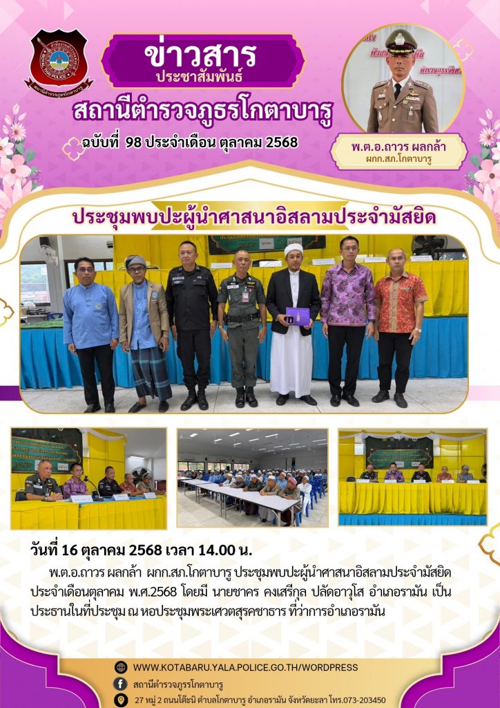 พบปะผู้นำศาสนา 18 ตุลาคม 2568 โดย หัสซาน สะแลมะ / ข่าวภารกิจผู้บังคับบัญชา วันที่ 16 ตุลาคม 2568 เวลา 14.00 น. พ.ต.อ.ถาวร ผลกล้า ผกก.สภ.โกตาบารู ประชุมพบปะผู้นำศาสนาอิสลามประจำมัสยิด ประจำเดือนตุลาคม พ.ศ.2568 โดยมี นายชาคร คงเสรีกุล ปลัดอาวุโส อำเภอรามัน เป็นประธานในที่ประชุม ณ หอประชุมพระเศวตสุรคชาธาร ที่ว่าการอำเภอรามัน Facebook iconFacebookTwitter iconTwitterLINE iconLine