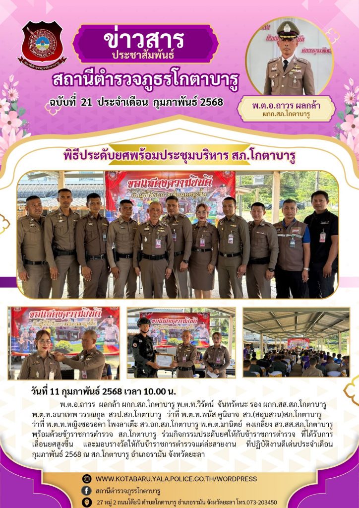 พ.ต.อ.ถาวร ผลกล้า ผกก.สภ.โกตาบารู พ.ต.ท.วิรัตน์ จันทรัตนะ รอง ผกก.สส.สภ.โกตาบารู พ.ต.ท.ธนาเทพ วรรณกูล สวป.สภ.โกตาบารู ว่าที่ พ.ต.ท.พนัส คูนิอาจ สว.(สอบสวน)สภ.โกตาบารู ว่าที่ พ.ต.ท.หญิงซอรอดา โพงลาเต๊ะ สว.อก.สภ.โกตาบารู พ.ต.ต.มานิตย์ คงเกลี้ยง สว.สส.สภ.โกตาบารู พร้อมด้วยข้าราชการตำรวจ สภ.โกตาบารู ร่วมกิจกรรมประดับยศให้กับข้าราชการตำรวจ ที่ได้รับการเลื่อนยศสูงขึ้น และมอบรางวัลให้กับข้าราชการตำรวจแต่ล่ะสายงาน ที่ปฏิบัติงานดีเด่นประจำเดือน กุมภาพันธ์ 2568 ณ สภ.โกตาบารู อำเภอรามัน จังหวัดยะลา