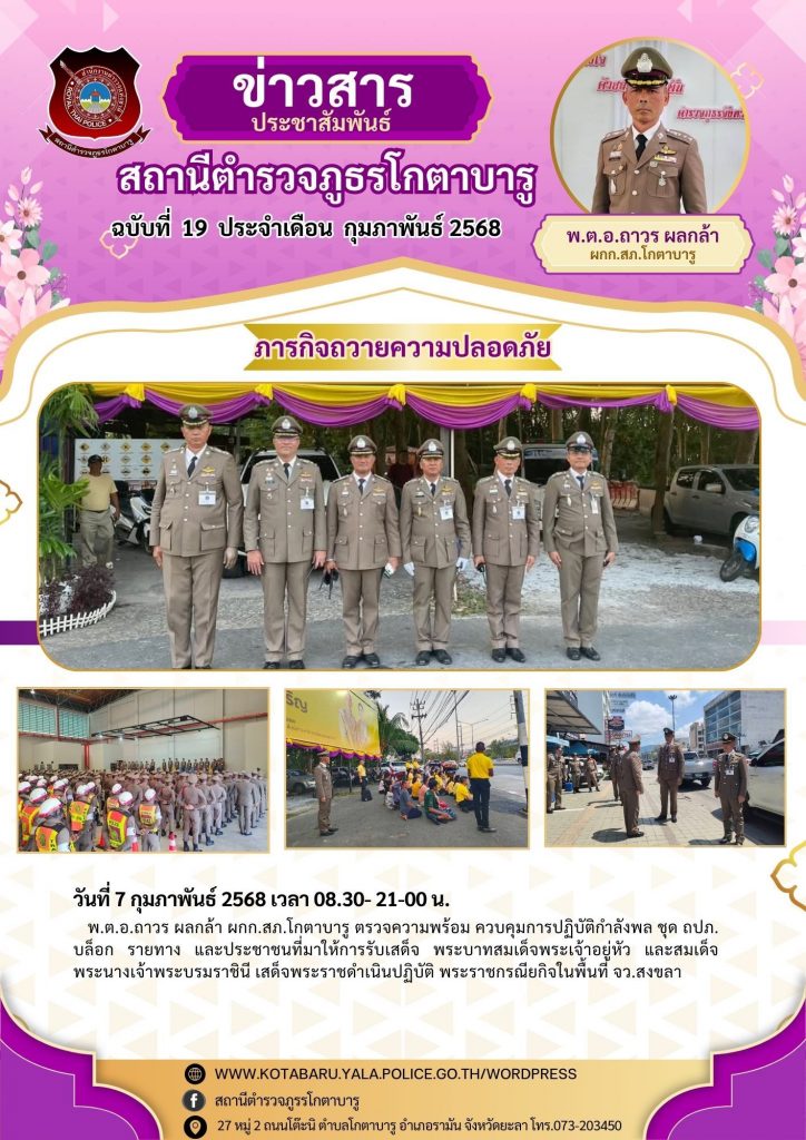 เวลา 08.30 -21.00 น. พ.ต.อ.ถาวร ผลกล้า ผกก.สภ.โกตาบารู ตรวจความพร้อม ควบคุมการปฏิบัติกำลังพล ชุด ถปภ. บล็อก รายทาง และประชาชนที่มาให้การรับเสด็จ พระบาทสมเด็จพระเจ้าอยู่หัว และสมเด็จพระนางเจ้าพระบรมราชินี เสด็จพระราชดำเนินปฏิบัติ พระราชกรณียกิจในพื้นที่ จว.สงขลา
