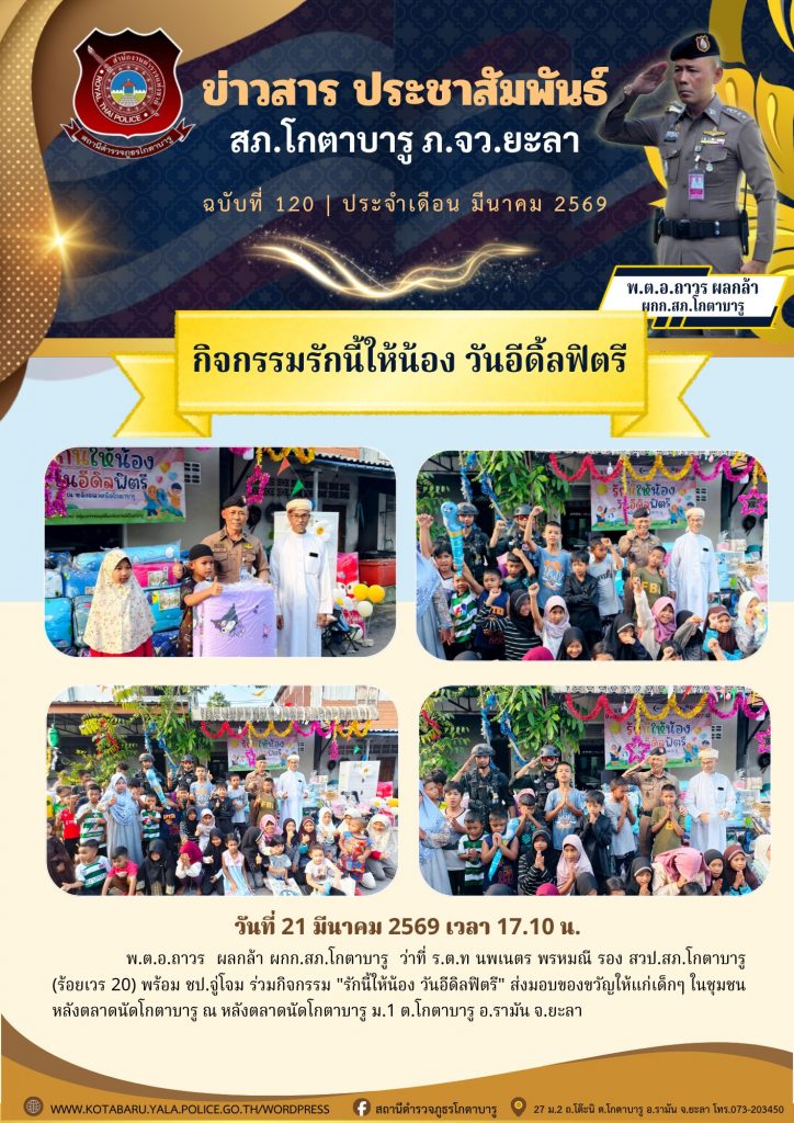 ร่วมกิจกรรมฮารีรายออีดิ้ลฟิตรี 21 มีนาคม 2569 โดย หัสซาน สะแลมะ / ข่าวภารกิจผู้บังคับบัญชา วันที่ 21 มี.ค. 69 เวลา 17.10 น. พ.ต.อ.ถาวร ผลกล้า ผกก.สภ.โกตาบารู ว่าที่ ร.ต.ท นพเนตร พรหมณี รอง สวป.สภ.โกตาบารู (ร้อยเวร 20) พร้อม ชป.จู่โจม และ ชุด ตชส. ร่วมกิจกรรม “รักนี้ให้น้อง วันอีดิลฟิตรี” ส่งมอบของขวัญให้แก่เด็กๆ ในชุมชนหลังตลาดนัดโกตาบารู ณ หลังตลาดนัดโกตาบารู ม.1 ต.โกตาบารู อ.รามัน จ.ยะลา Facebook iconFacebookTwitter iconTwitterLINE iconLine