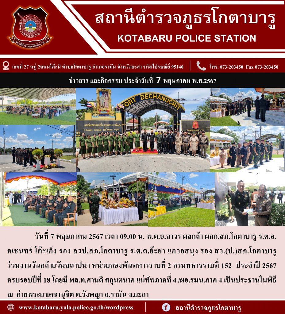 วันที่ 7 พฤษภาคม 2567 เวลา 09.00 น. พ.ต.อ.ถาวร ผลกล้า ผกก.สภ.โกตาบารู ร.ต.อ.คเชนทร์ โต๊ะเด็ง รอง สวป.สภ.โกตาบารู ร.ต.ต.ย๊ะยา แดวอสนุง รอง สว.(ป.)สภ.โกตาบารู ร่วมงานวันคล้ายวันสถาปนา หน่วยกองพันทหารราบที่ 2 กรมทหารราบที่ 152 ประจำปี 2567ครบรอบปีที่ 18 โดยมี พล.ท.ศานติ ศกุนตนาค แม่ทัพภาคที่ 4 /ผอ.รมน.ภาค 4 เป็นประธานในพิธี ณ ค่ายพระยาเดชานุชิต ต.วังพญา อ.รามัน จ.ยะลา