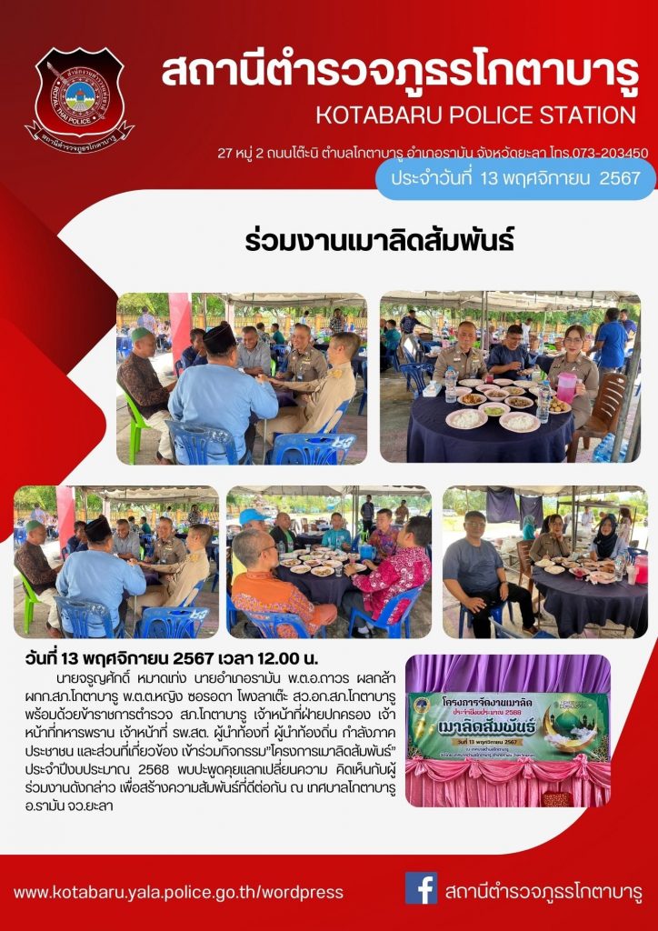 ร่วมงานเมาลิดสัมพันธ์ 14 พฤศจิกายน 2567 โดย อัมรอน หะระตี / ข่าวภารกิจผู้บังคับบัญชา Facebook iconFacebookTwitter iconTwitterLINE iconLine