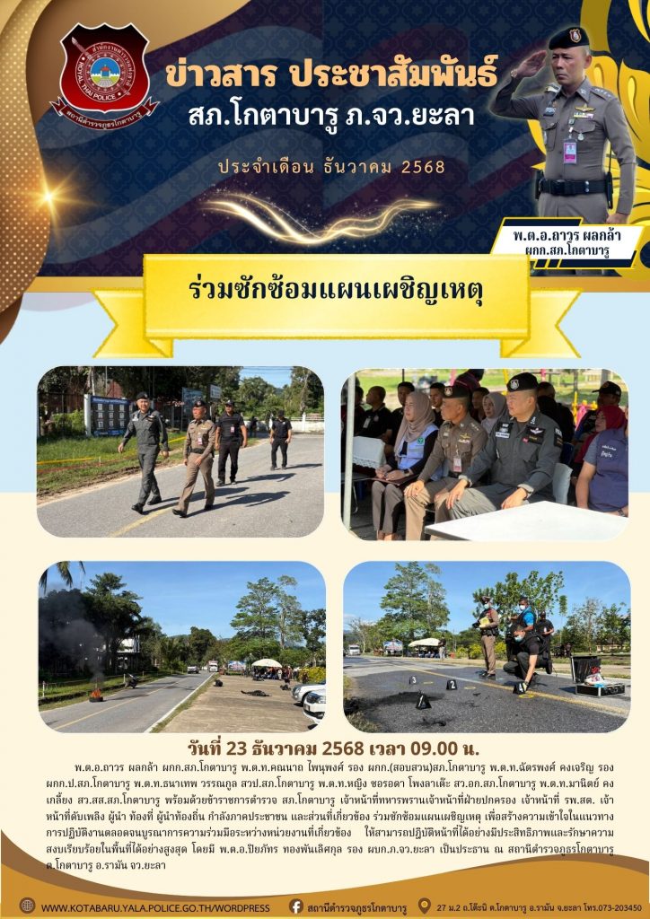 พ.ต.อ.ถาวร ผลกล้า ผกก.สภ.โกตาบารู พ.ต.ท.คณนาถ ไพนุพงศ์ รอง ผกก.(สอบสวน)สภ.โกตาบารู พ.ต.ท.ฉัตรพงศ์ คงเจริญ รอง ผกก.ป.สภ.โกตาบารู พ.ต.ท.ธนาเทพ วรรณกูล สวป.สภ.โกตาบารู พ.ต.ท.หญิง ซอรอดา โพงลาเต๊ะ สว.อก.สภ.โกตาบารู พ.ต.ท.มานิตย์ คงเกลี้ยง สว.สส.สภ.โกตาบารู พร้อมด้วยข้าราชการตำรวจ สภ.โกตาบารู เจ้าหน้าที่ทหารพรานเจ้าหน้าที่ฝ่ายปกครอง เจ้าหน้าที่ รพ.สต. เจ้าหน้าที่ดับเพลิง ผู้นำ ท้องที่ ผู้นำท้องถิ่น กำลังภาคประชาชน และส่วนที่เกี่ยวข้อง ร่วมซักซ้อมแผนเผชิญเหตุ เพื่อสร้างความเข้าใจในแนวทางการปฏิบัติงานตลอดจนบูรณาการความร่วมมือระหว่างหน่วยงานที่เกี่ยวข้อง ให้สามารถปฎิบัติหน้าที่ได้อย่างมีประสิทธิภาพและรักษาความสงบเรียบร้อยในพื้นที่ได้อย่างสูงสุด โดยมี พ.ต.อ.ปิยภัทร ทองพันเลิศกุล รอง ผบก.ภ.จว.ยะลา เป็นประธาน ณ สถานีตำรวจภูธรโกตาบารู ต.โกตาบารู อ.รามัน จว.ยะลา