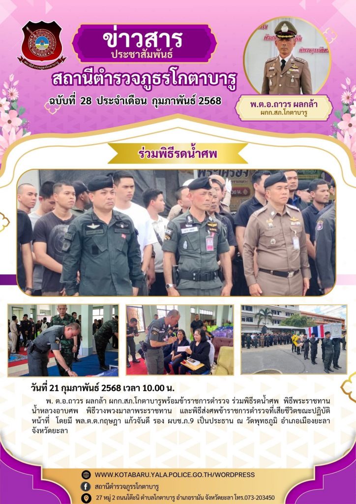 พ.ต.อ.ถาวร ผลกล้า ผกก.สภ.โกตาบารู พร้อมข้าราชการตำรวจ ร่วมพิธีรดน้ำศพ พิธีพระราชทานน้ำหลวงอาบศพ พิธีวางพวงมาลาพระราชทาน และพิธีส่งศพข้าราชการตำรวจที่เสียชีวิตขณะปฏิบัติหน้าที่ โดยมี พล.ต.ต.กฤษฎา แก้วจันดี รอง ผบช.ภ.9 เป็นประธาน ณ วัดพุทธภูมิ อำเภอเมืองยะลา จังหวัดยะลา