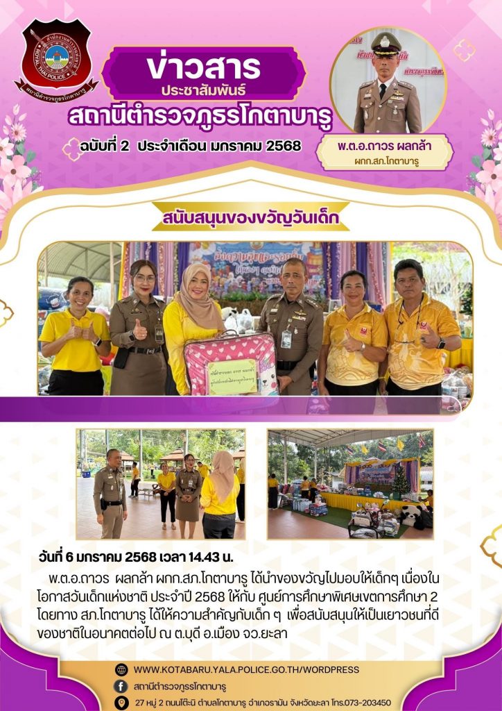 เวลา 14.43 น.พ.ต.อ.ถาวร ผลกล้า ผกก.สภ.โกตาบารู ได้นำของขวัญไปมอบให้เด็กๆ เนื่องในโอกาสวันเด็กแห่งชาติ ประจำปี 2568 ให้กับ ศูนย์การศึกษาพิเศษเขตการศึกษา 2 โดยทาง สภ.โกตาบารู ได้ให้ความสำคัญกับเด็ก ๆ เพื่อสนับสนุนให้เป็นเยาวชนที่ดีของชาติในอนาคตต่อไป ณ ต.บุดี อ.เมือง จว.ยะลา