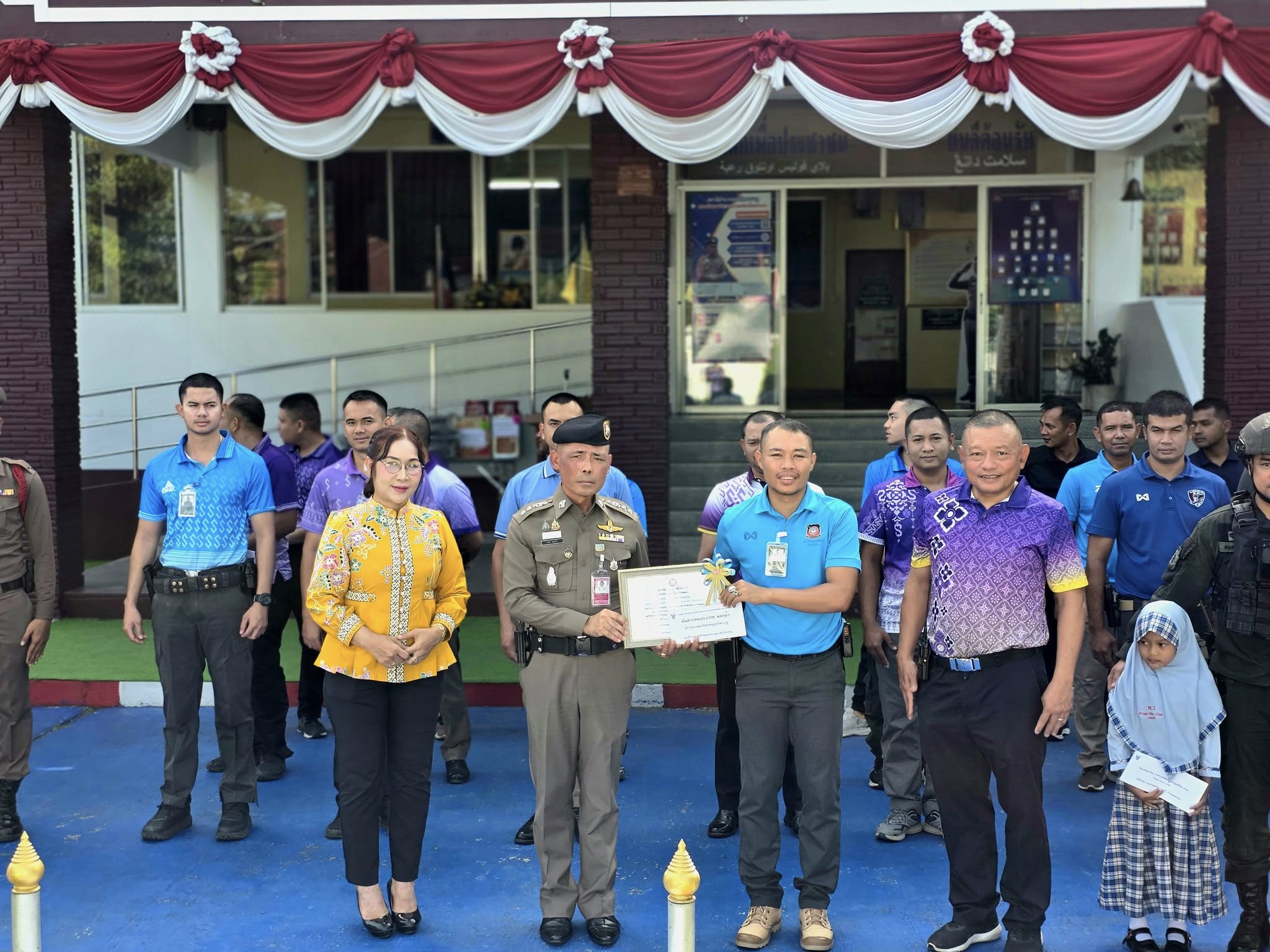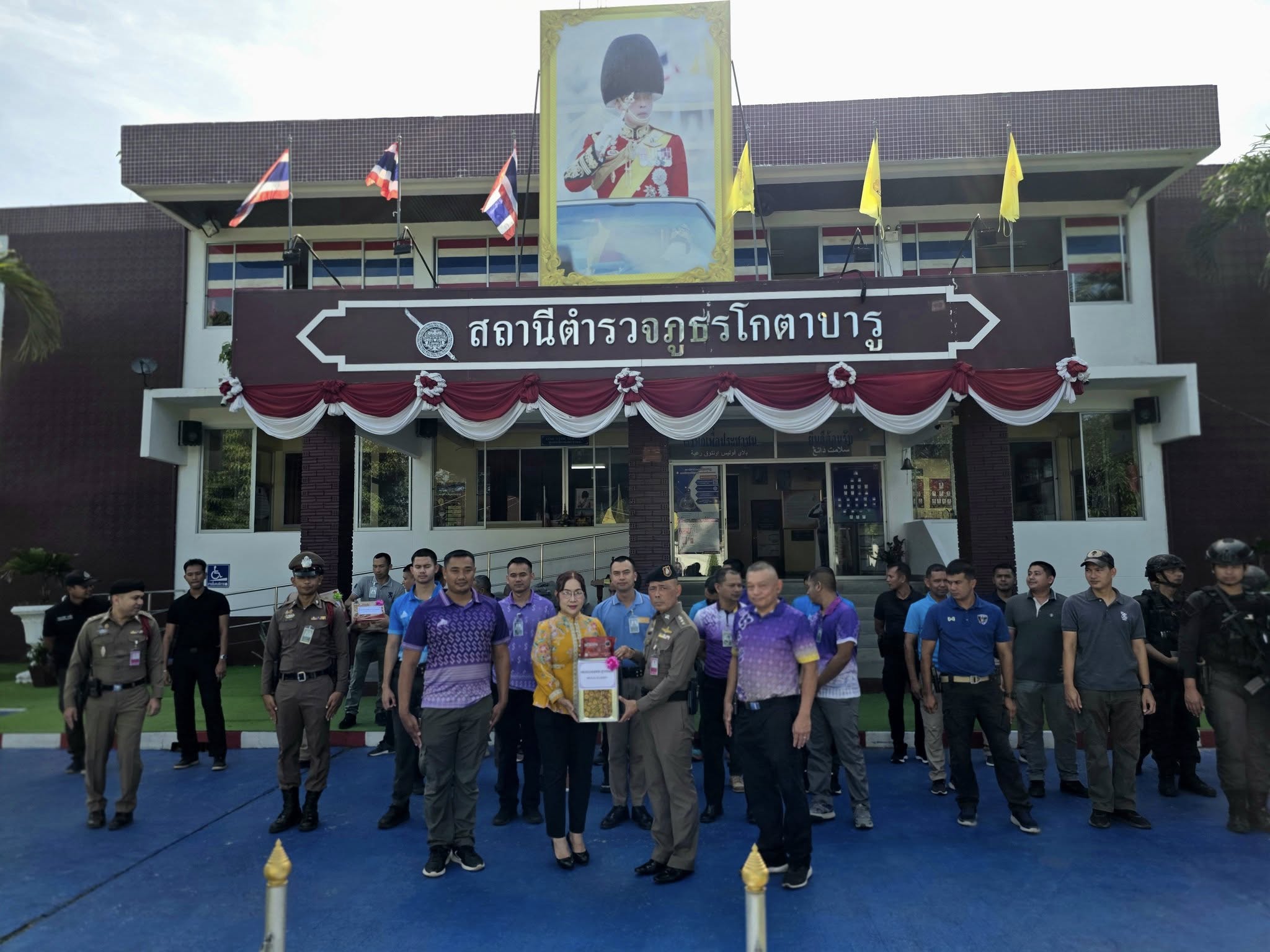 พ.ต.อ.ถาวร ผลกล้า ผกก.สภ.โกตาบารู พ.ต.ท.คณนาถ ไพนุงพงศ์ รอง ผกก.(สอบสวน)สภ.โกตาบารู พ.ต.ท.ธนาเทพ วรรณกูล สวป.สภ.โกตาบารู พ.ต.ท.หญิง ซอรอดา โพงลาเต๊ะ สว.อก.สภ.โกตาบารู พ.ต.ท.มานิตย์ คงเกลี้ยง สว.สส.สภ.โกตาบารู เรียกแถว ข้าราชการตำรวจ สภ.โกตาบารู ลงแถวประจำวัน เคารพธงชาติ กล่าวบทปลงใจ อุดมคติ คำสัตย์ปฏิญาน ตรวจสอบความพร้อมในการปฏิบัติหน้าที่และกำชับข้อราชการ พร้อมมอบรางวัลและของบำรุงขวัญดังนี้