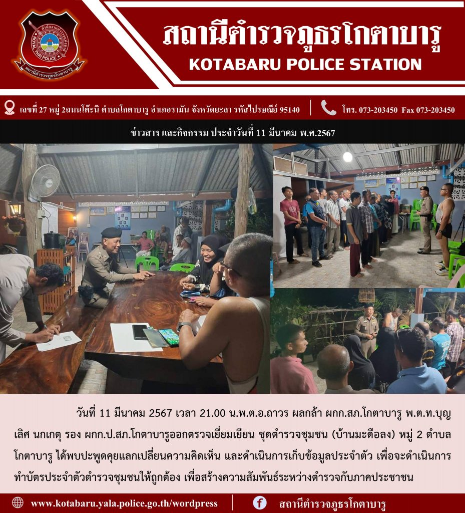 สร้างความเข้มแข็งให้กับชุมชน 18 เมษายน 2567 โดย อัมรอน หะระตี / ข่าวภารกิจผู้บังคับบัญชา วันที่ 11 มีนาคม 2567 เวลา 21.00 น.พ.ต.อ.ถาวร ผลกล้า ผกก.สภ.โกตาบารู พ.ต.ท.บุญเลิศ นกเกตุ รอง ผกก.ป.สภ.โกตาบารูออกตรวจเยี่ยมเยียน ชุดตำรวจชุมชน (บ้านมะดือลง) หมู่ 2 ตำบลโกตาบารู ได้พบปะพูดคุยแลกเปลี่ยนความคิดเห็น และดำเนินการเก็บข้อมูลประจำตัว เพื่อจะดำเนินการทำบัตรประจำตัวตำรวจชุมชนให้ถูกต้อง เพื่อสร้างความสัมพันธ์ระหว่างตำรวจกับภาคประชาชน Facebook iconFacebookTwitter iconTwitterLINE iconLine