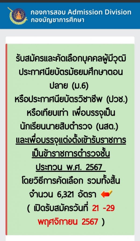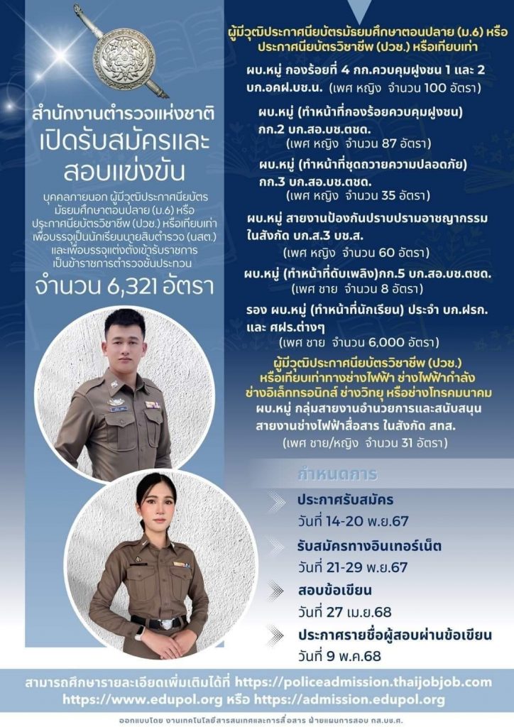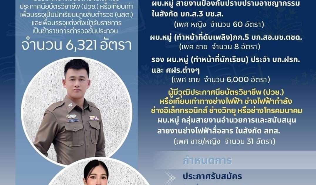 ผู้มีวุฒิ ประกาศนียบัตรมัธยมศึกษาตอนปลาย(ม.6) หรือประกาศนียบัตร วิชาชีพ(ปวช.) หรือเทียบเท่า เพื่อบรรจุเป็นนักเรียนนายสิบตำรวจ(นสต.) และเพื่อบรรจุแต่งตั้งเข้ารับราชการเป็นข้าราชการตำรวจชั้นประทวนประจำปีงบประมาณ พ.ศ.2566 และประจำปีงบประมาณ พ.ศ.2567 จำนวน 6,321 อัตรา