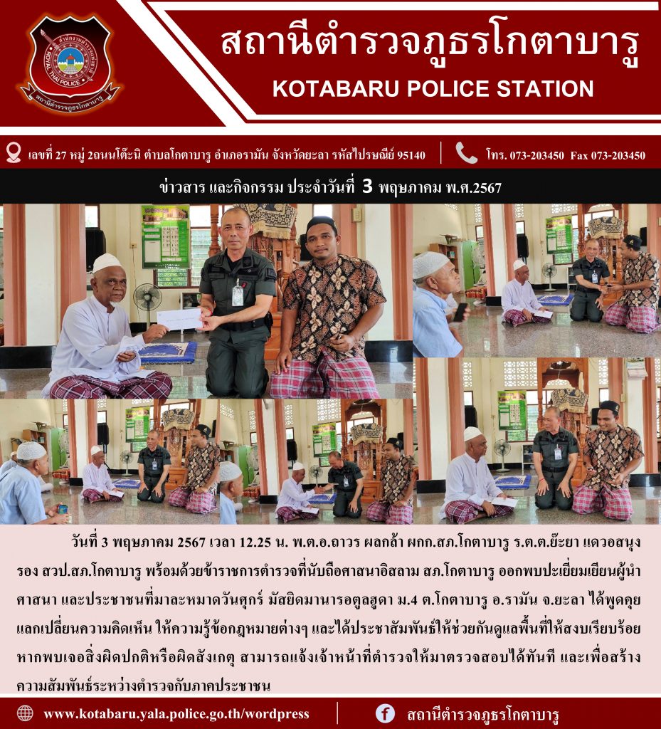 ออกพบปะเยี่ยมเยียนผู้นำศาสนา 3 พฤษภาคม 2567 โดย อัมรอน หะระตี / ข่าวภารกิจผู้บังคับบัญชา วันที่ 3 พฤษภาคม 2567 เวลา 12.25 น. พ.ต.อ.ถาวร ผลกล้า ผกก.สภ.โกตาบารู ร.ต.ต.ย๊ะยา แดวอสนุง รอง สวป.สภ.โกตาบารู พร้อมด้วยข้าราชการตำรวจที่นับถือศาสนาอิสลาม สภ.โกตาบารู ออกพบปะเยี่ยมเยียนผู้นำศาสนา และประชาชนที่มาละหมาดวันศุกร์ มัสยิดมานารอตูลฮูดา ม.4 ต.โกตาบารู อ.รามัน จ.ยะลา ได้พูดคุยแลกเปลี่ยนความคิดเห็น ให้ความรู้ข้อกฎหมายต่างๆ และได้ประชาสัมพันธ์ให้ช่วยกันดูแลพื้นที่ให้สงบเรียบร้อย หากพบเจอสิ่งผิดปกติหรือผิดสังเกตุ สามารถแจ้งเจ้าหน้าที่ตำรวจให้มาตรวจสอบได้ทันที และเพื่อสร้างความสัมพันธ์ระหว่างตำรวจกับภาคประชาชน Facebook iconFacebookTwitter iconTwitterLINE iconLine