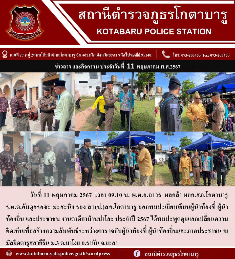 วันที่ 11 พฤษภาคม 2567 เวลา 09.10 น. พ.ต.อ.ถาวร ผลกล้า ผกก.สภ.โกตาบารู ร.ต.ต.อับดุลรอซะ มะสะนิง รอง สว(ป.)สภ.โกตาบารู ออกพบปะเยี่ยมเยียนผู้นำท้องที่ ผู้นำท้องถิ่น และประชาชน งานตาดีกาบ้านปาโละ ประจำปี 2567 ได้พบปะพูดคุยแลกเปลี่ยนความคิดเห็นเพื่อสร้างความสัมพันธ์ระหว่างตำรวจกับผู้นำท้องที่ ผู้นำท้องถิ่นและภาคประชาชน ณ มัสยิดดารุสสากีรีน ม.3 ต.บาโงย อ.รามัน จ.ยะลา