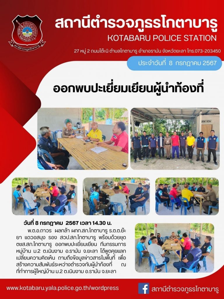 ออกพบปะเยี่ยมเยียนผู้นำท้องที่ 9 กรกฎาคม 2567 โดย admin / ข่าวภารกิจผู้บังคับบัญชา Facebook iconFacebookTwitter iconTwitterLINE iconLine