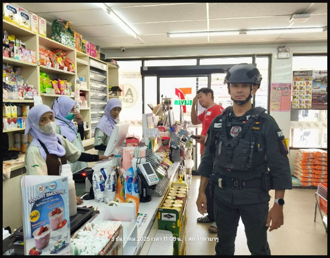 เมื่อ​วันที่​ 3 ธ.ค.68 เวลา 14.30​ น. ภายใต้อำนวยการ พ.ต.อ.ถาวร ผลกล้า ผกก.สภ.โกตาบารู พ.ต.ท.ฉัตรพงศ์  คงเจริญ รอง ผกก.ป.สภ.โกตาบารู,พ.ต.ท.ธนาเทพ วรรณกูล สวป.สภ.โกตาบารู สั่งการให้ ร.ต.ท.นพเนตร พรหมณี รอง สวป. สภ.โกตาบารู (ร้อยเวร 20) ออกลาดตระเวนตรวจสอบความเรียบร้อยและรักษาความปลอดภัย ร้านสะดวกซื้อ  มินิบิ๊กซี, เซเว่น, ปั้มน้ำมัน, พร้อมพบปะพูดคุยกับประชาชนในพื้นที่