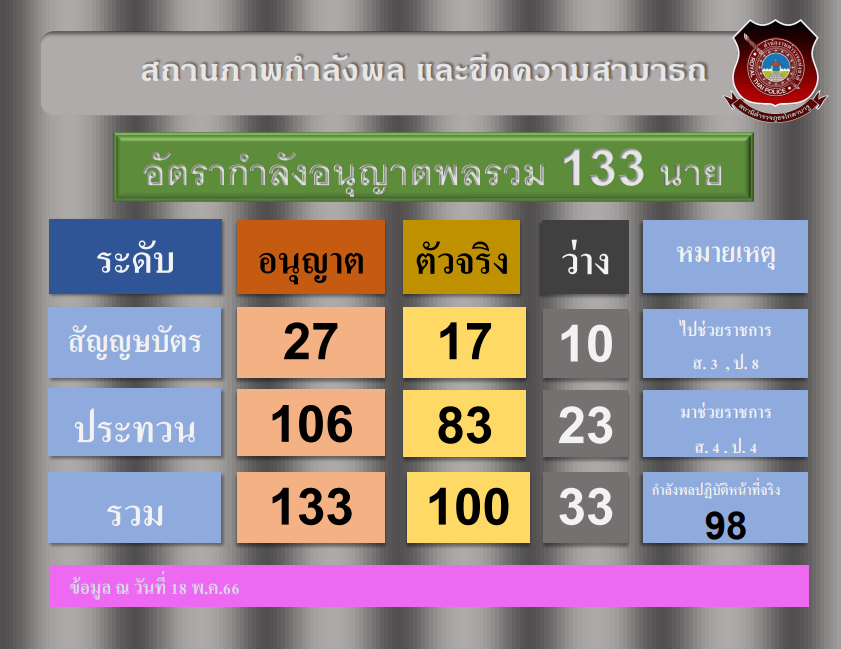 อัตรากำลังของสถานีตำรวจ 23 พฤษภาคม 2566 โดย admin / ไม่มีหมวดหมู่ ข้อมูล ณ วันที่ 22 พ.ค. 2566 Facebook iconFacebookTwitter iconTwitterLINE iconLine