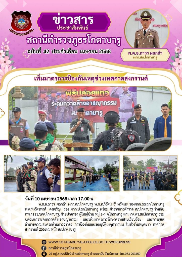 พ.ต.อ.ถาวร ผลกล้า ผกก.สภ.โกตาบารู พ.ต.ท.วิรัตน์ จันทรัตนะ รอง ผกก.สส.สภ.โกตาบารู พ.ต.ท.ฉัตรพงศ์ คงเจริญ รอง ผกก.ป.สภ.โกตาบารู พร้อม ข้าราชการตำรวจ สภ.โกตาบารู ร่วมกับทพ.4111,ชคต.โกตาบารู, ฝ่ายปกครอง ผู้ใหญ่บ้าน หมู่ 1-4 ต.โกตาบารู และ กต.ตร.สภ.โกตาบารู ร่วมปล่อยแถวระดมกวาดล้างอาชญากรรม และเพิ่มมาตรการรักษาความสงบเรียบร้อย และการดูแลอำนวยความสะดวกด้านการจราจร การป้องกันและลดอุบัติเหตุทางถนน ในช่วงวันหยุดยาว เทศกาลสงกรานต์ 2568 ณ หน้า สภ.โกตาบารู