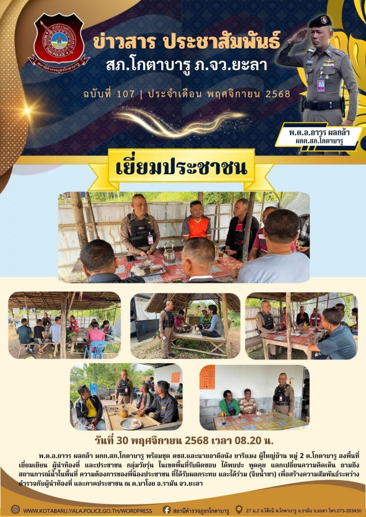 เยี่ยมประชาชน 30 พฤศจิกายน 2568 โดย หัสซาน สะแลมะ / ข่าวภารกิจผู้บังคับบัญชา วันที่ 30 พฤศจิกายน 2568 เวลา 08.20 น. พ.ต.อ.ถาวร ผลกล้า ผกก.สภ.โกตาบารู พร้อมชุด ตชส.และนายอาดือนัง ยาริแมง ผู้ใหญ่บ้าน หมู่ 2 ต.โกตาบารู ลงพื้นที่เยี่ยมเยียน ผู้นำท้องที่ และประชาชน กลุ่มวัยรุ่น ในเขตพื้นที่รับผิดชอบ ได้พบปะ พูดคุย แลกเปลี่ยนความคิดเห็น ถามถึงสถานการณ์น้ำในพื้นที่ ความต้องการของพี่น้องประชาชน ที่ได้รับผลกระทบ และได้ร่วม (จิบน้ำชา) เพื่อสร้างความสัมพันธ์ระหว่างตำรวจกับผู้นำท้องที่ และภาคประชาชน ณ ต.บาโงย อ.รามัน จว.ยะลา Facebook iconFacebookTwitter iconTwitterLINE iconLine