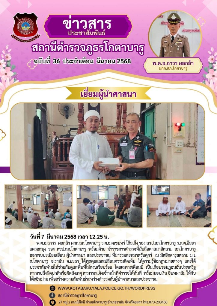 พ.ต.อ.ถาวร ผลกล้า ผกก.สภ.โกตาบารู ร.ต.อ.คเชนทร์ โต๊ะเด็ง รอง สวป.สภ.โกตาบารู ร.ต.ต.ย๊ะยา แดวอสนุง รอง สวป.สภ.โกตาบารู พร้อมด้วย ข้าราชการตำรวจที่นับถือศาสนาอิสลาม สภ.โกตาบารู ออกพบปะเยี่ยมเยียน ผู้นำศาสนา และประชาชน ที่มาร่วมละหมาดวันศุกร์ ณ มัสยิดดารุสสลาม ม.1 ต.โกตาบารู อ.รามัน จ.ยะลา ได้พูดคุยแลกเปลี่ยนความคิดเห็น ให้ความรู้ข้อกฏหมายต่างๆ และได้ประชาสัมพันธ์ให้ช่วยกันดูแลพื้นที่ให้สงบเรียบร้อย โดยเฉพาะเดือนนี้ เป็นเดือนรอมฎอนอันประเสริฐ หากพบสิ่งผิดปกติหรือผิดสังเกตุ สามารถแจ้งเจ้าหน้าที่ตำรวจได้ทันที พร้อมมอบเงิน อินทผาลัม ให้กับโต๊ะอิหม่าม เพื่อสร้างความสัมพันธ์ระหว่างตำรวจกับผู้นำศาสนาและประชาชน