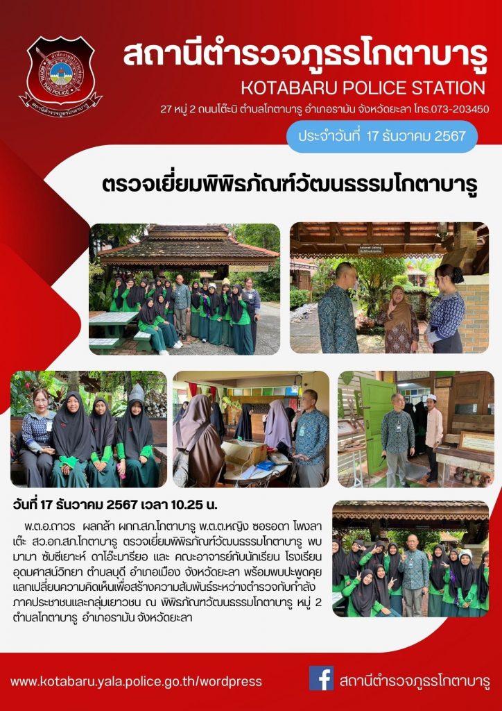 พ.ต.อ.ถาวร ผลกล้า ผกก.สภ.โกตาบารู พ.ต.ต.หญิง ซอรอดา โพงลาเต๊ะ สว.อก.สภ.โกตาบารู ตรวจเยี่ยมพิพิธภัณฑ์วัฒนธรรมโกตาบารู พบ มามา ซัมซีเยาะห์ ดาโอ๊ะมารียอ และ คณะอาจารย์กับนักเรียน โรงเรียนอุดมศาสน์วิทยา ตำบลบุดี อำเภอเมือง จังหวัดยะลา พร้อมพบปะพูดคุยแลกเปลี่ยนความคิดเห็นเพื่อสร้างความสัมพันธ์ระหว่างตำรวจกับกำลังภาคประชาชนและกลุ่มเยาวชน ณ พิพิธภัณฑ์วัฒนธรรมโกตาบารู หมู่ 2 ตำบลโกตาบารู อำเภอรามัน จังหวัดยะลา