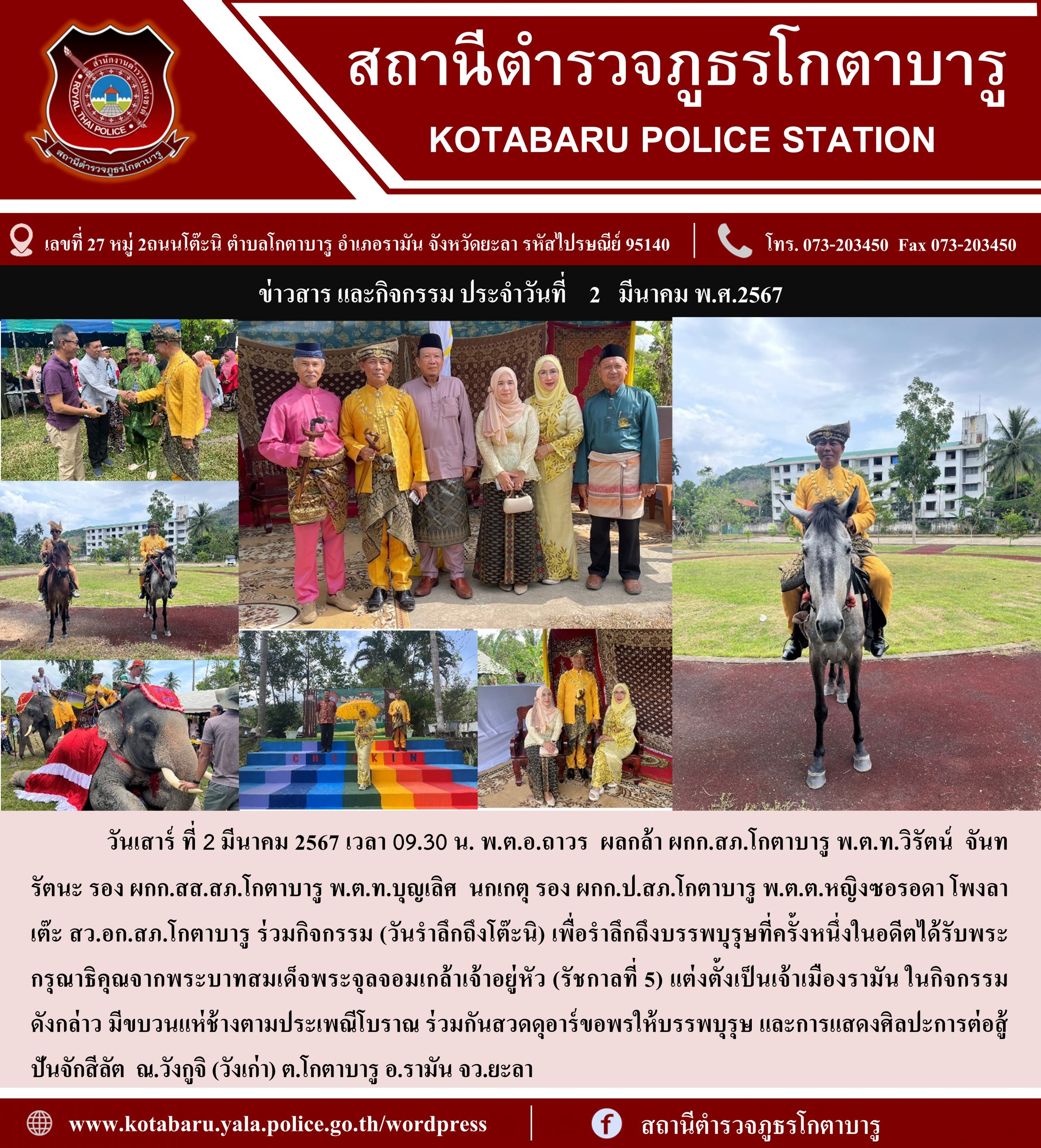 วันเสาร์ ที่ 2 มีนาคม 2567 เวลา 09.30 น. พ.ต.อ.ถาวร ผลกล้า ผกก.สภ.โกตาบารู พ.ต.ท.วิรัตน์ จันทรัตน
