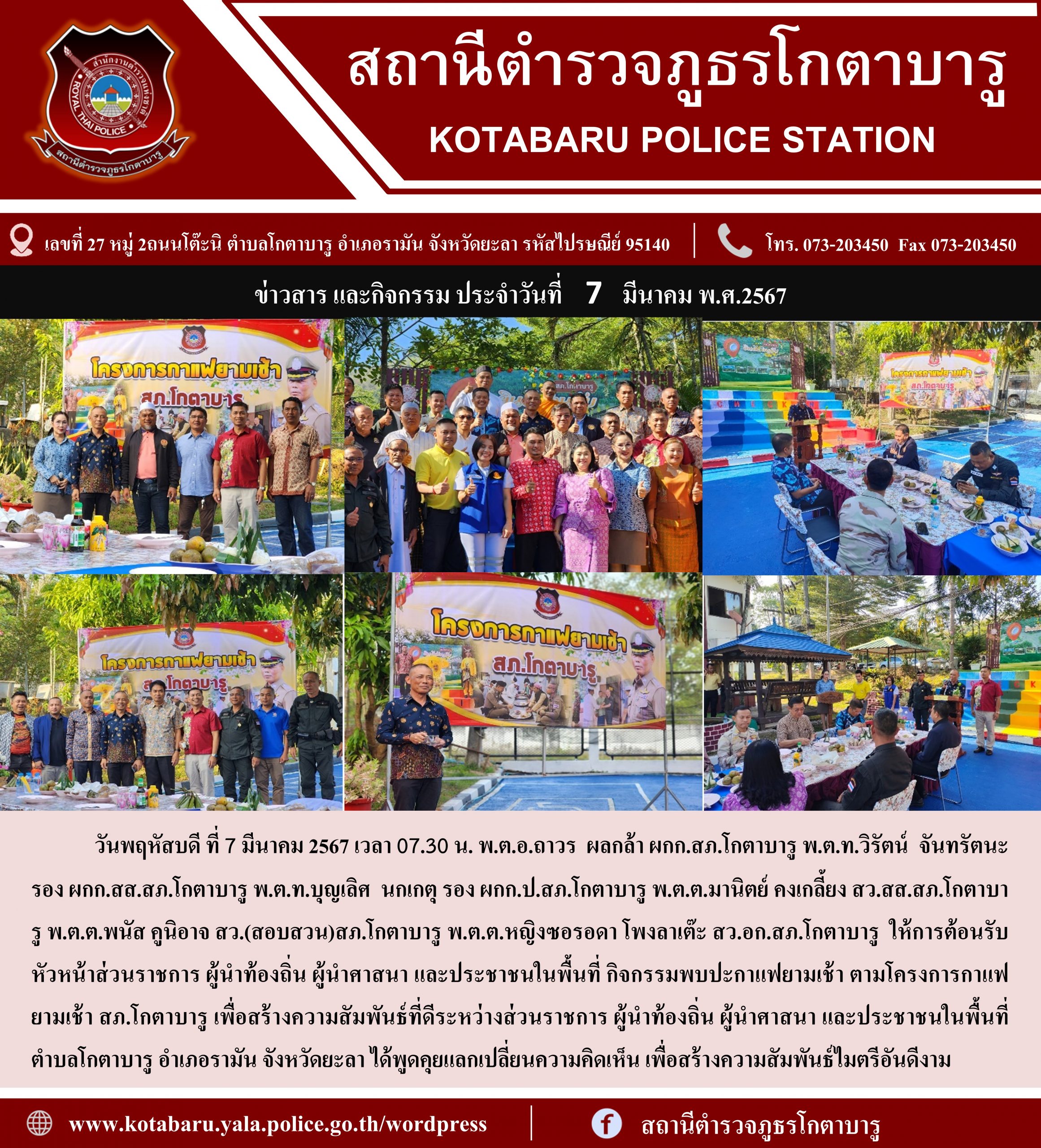 วันพฤหัสบดี ที่ 7 มีนาคม 2567 เวลา 07.30 น. พ.ต.อ.ถาวร ผลกล้า ผกก.สภ.โกตาบารู พ.ต.ท.วิรัตน์ จันทรั