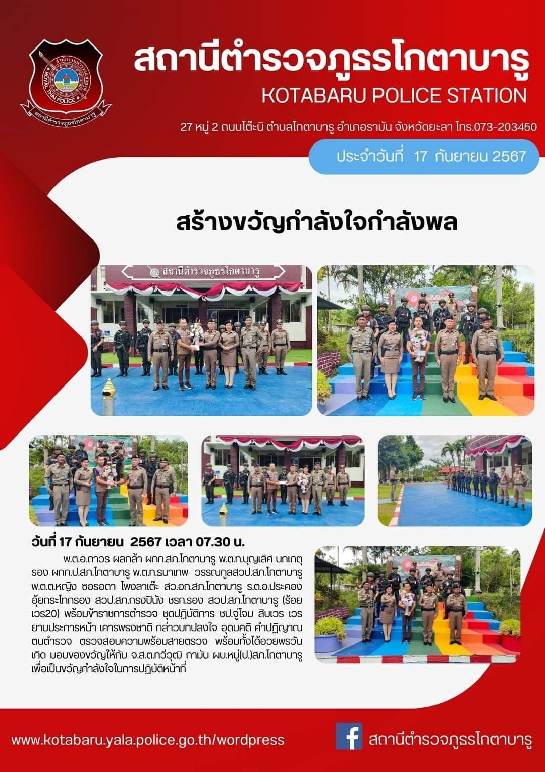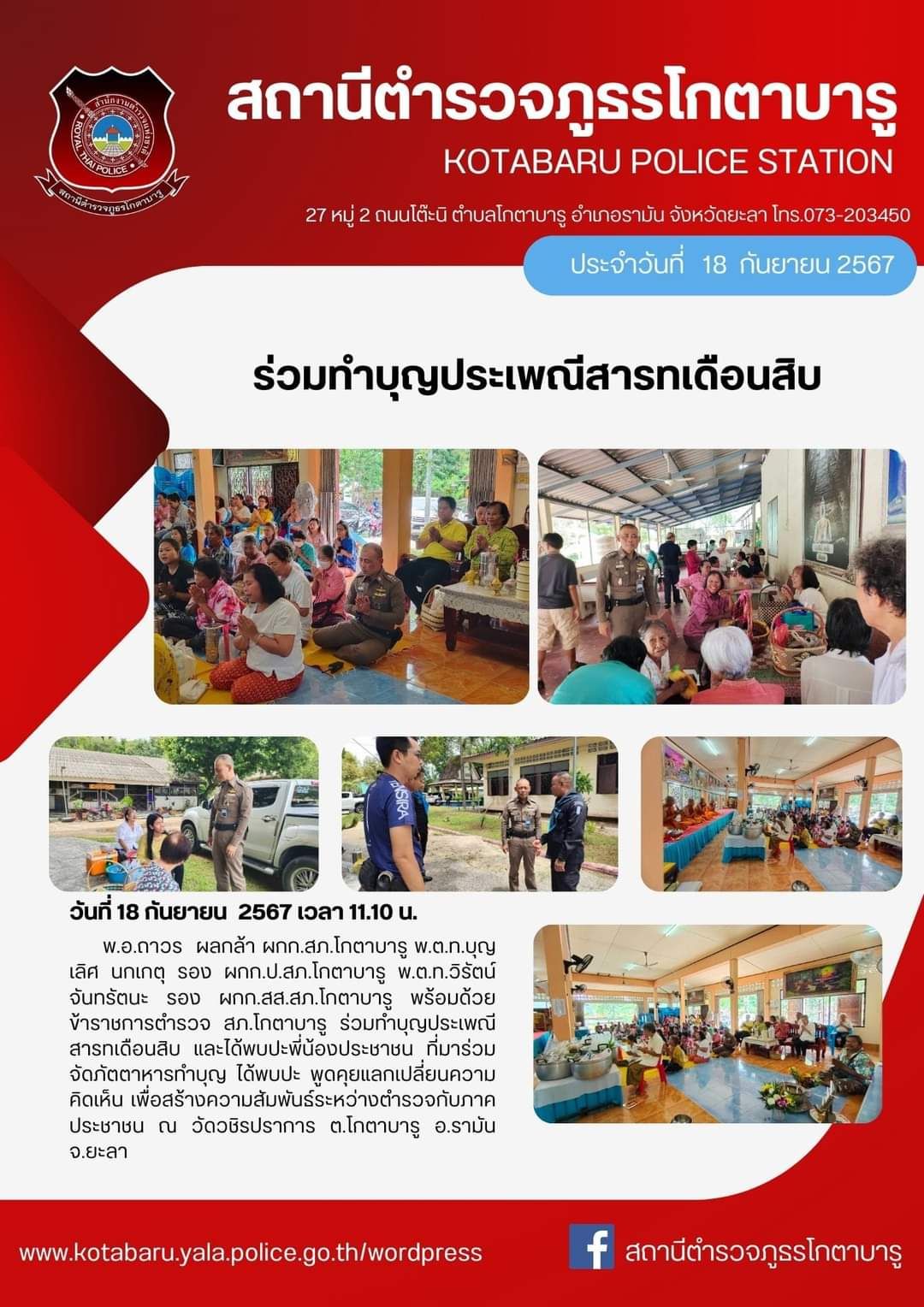 วันนี้ 16 กันยายน 2567เวลาประมาณ 09.00 น.พ.ต.ท.วิรัตน์ จันทรัตนะ รอง ผกก.สส.สภ.โกตาบารู เข้าร่วมกิจก