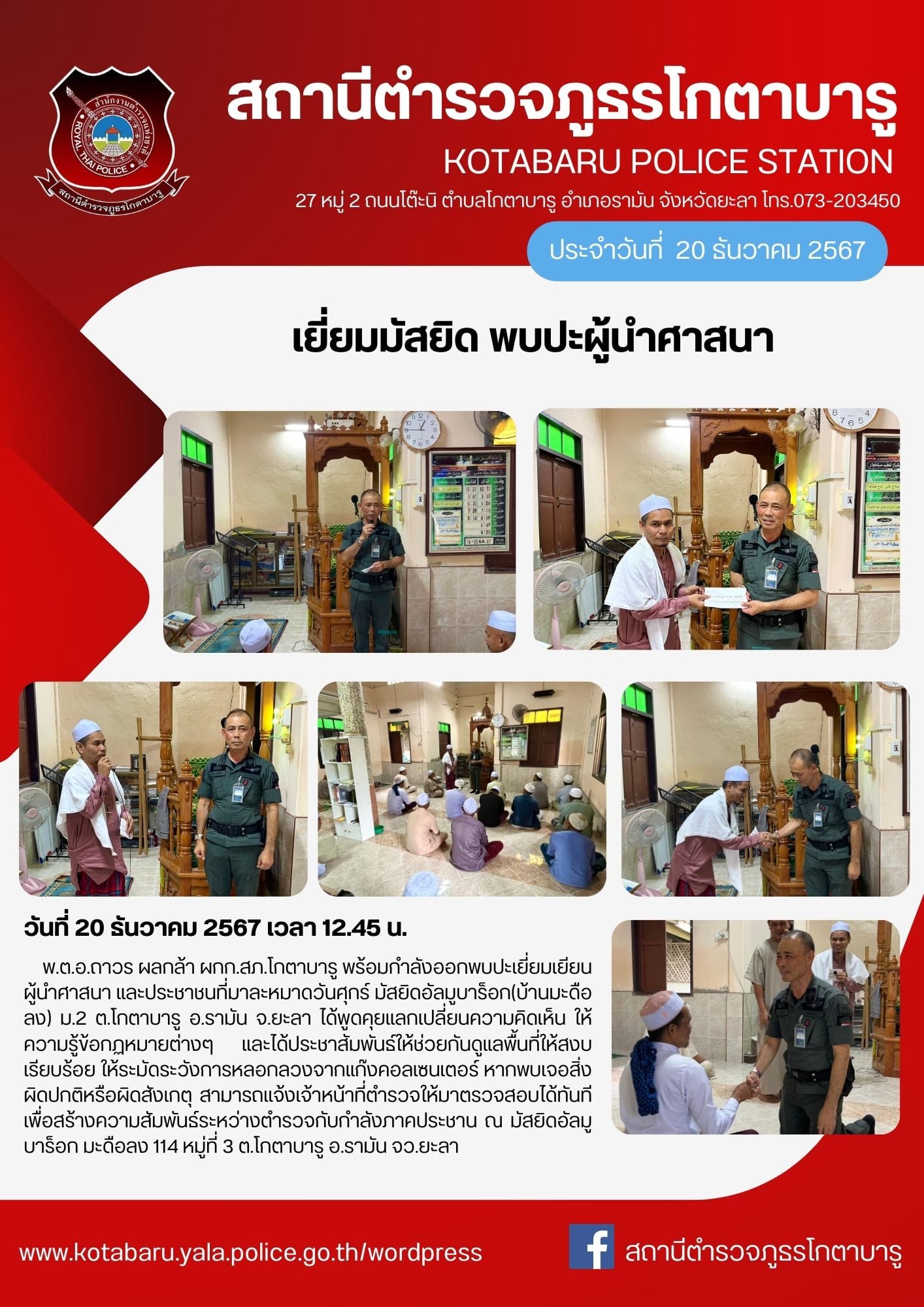 วันที่ 20 ธันวาคม 2567 เวลา 12.45 น. พ.ต.อ.ถาวร ผลกล้า ผกก.สภ.โกตาบารู พร้อมกำลังออกพบปะเยี่ยมเยียนผ