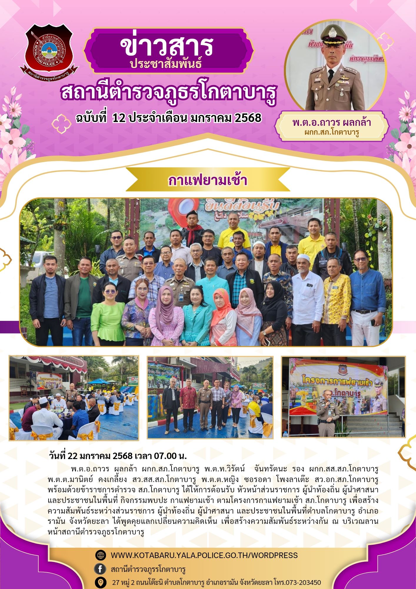 วันที่ 22 มกราคม 2568 เวลา 07.00 น. พ.ต.อ.ถาวร ผลกล้า ผกก.สภ.โกตาบารู พ.ต.ท.วิรัตน์ จันทรัตนะ รอง ผก
