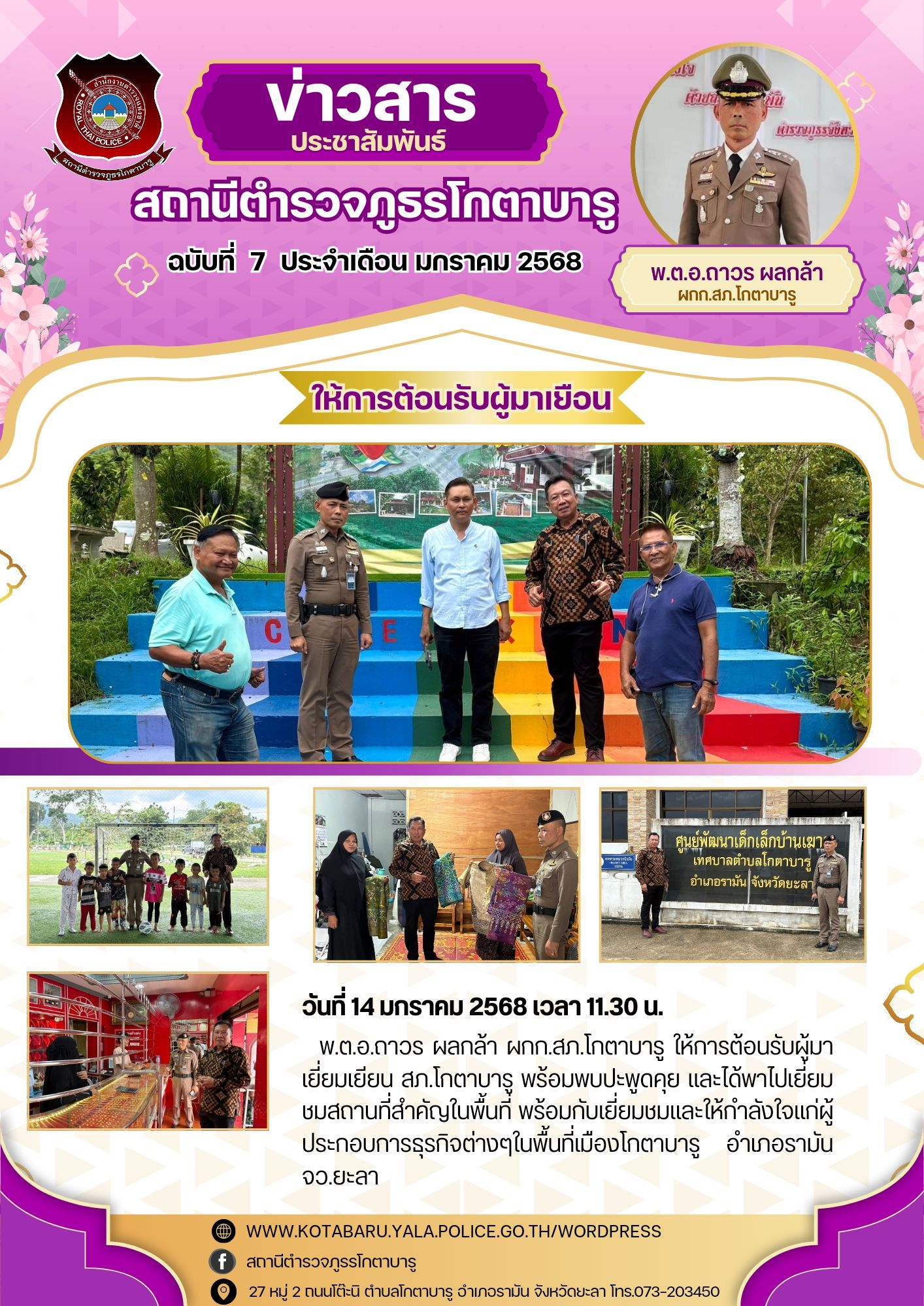 วันที่ 14 มกราคม 2568 เวลา 11.31 น. พ.ต.อ.ถาวร ผลกล้า ผกก.สภ.โกตาบารู ให้การต้อนรับผู้มาเยี่ยมเยียน