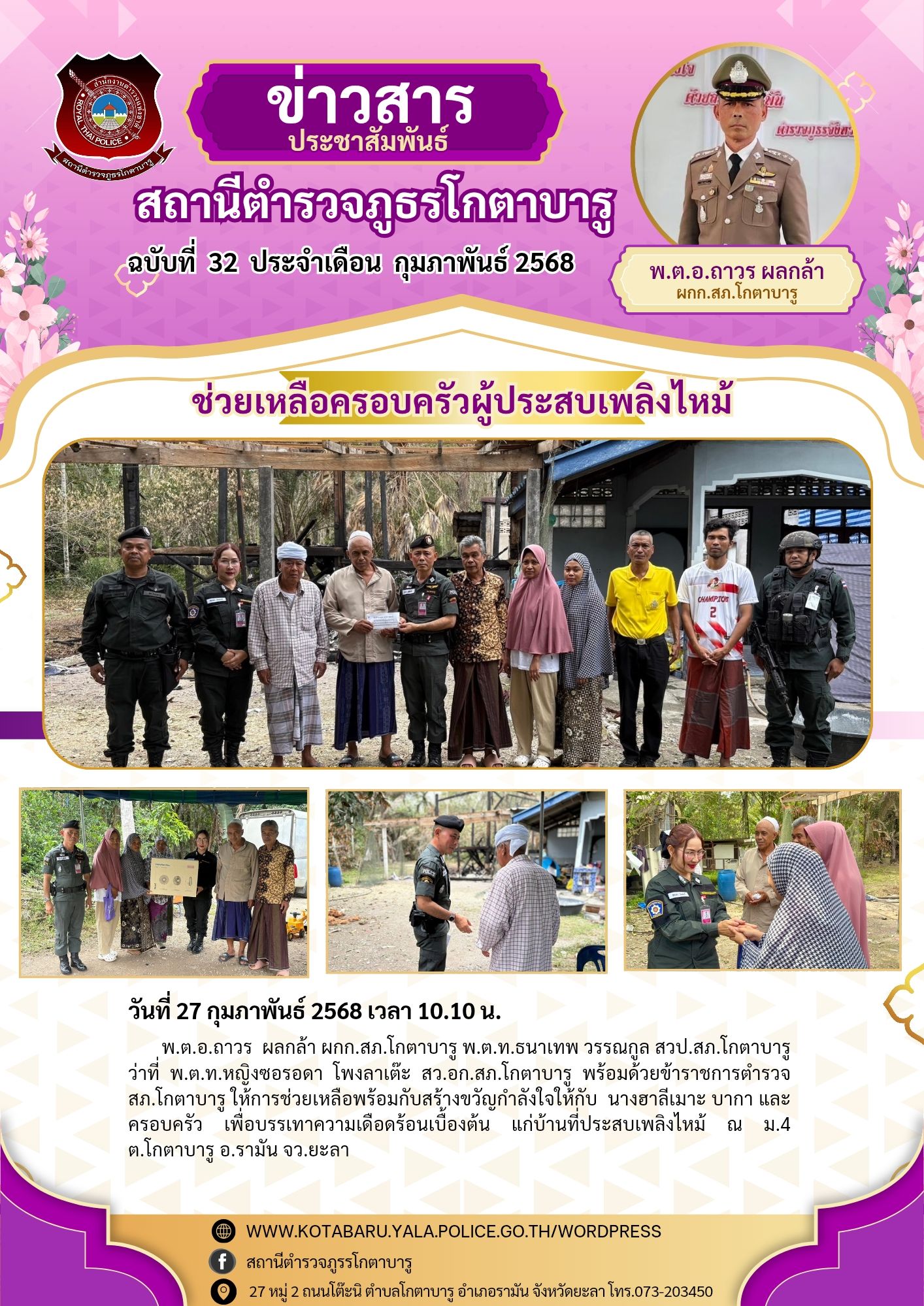 วันที่ 27 กุมภาพันธ์ 2568 เวลา 10.10 น. พ.ต.อ.ถาวร ผลกล้า ผกก.สภ.โกตาบารู พ.ต.ท.ธนาเทพ วรรณกูล สวป.ส