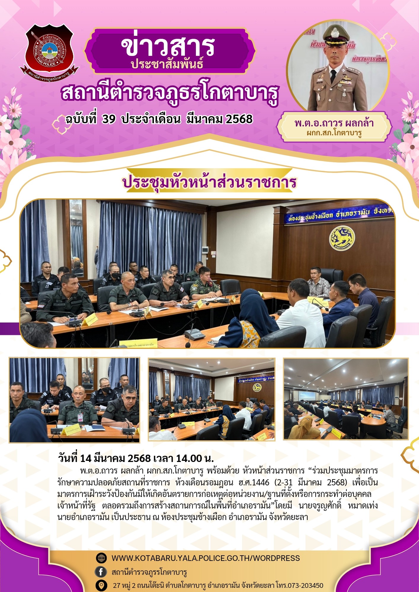 วันที่ 14 มีนาคม 2568 เวลา 14.00 น. พ.ต.อ.ถาวร ผลกล้า ผกก.สภ.โกตาบารู พร้อมด้วย หัวหน้าส่วนราชการ“ร่