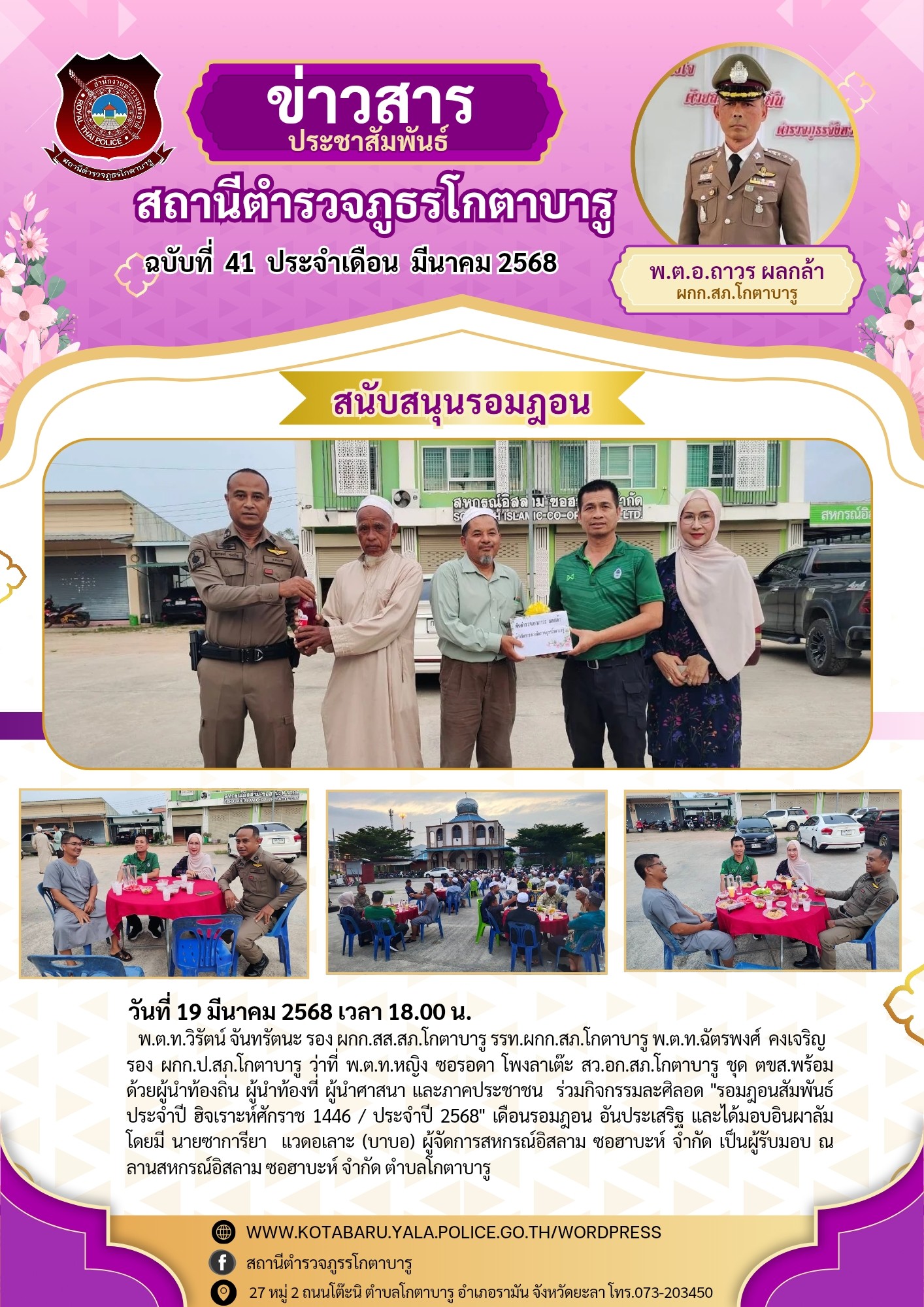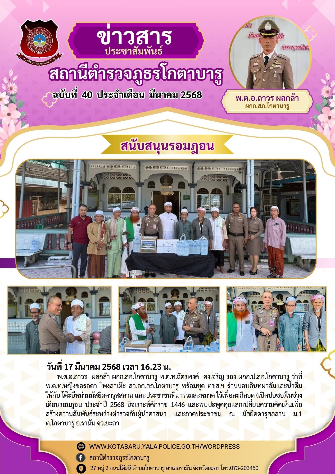 วันที่ 19 มีนาคม 2568 .เวลา 18.00 น. พ.ต.ท.วิรัตน์ จันทรัตนะรอง ผกก.สส.สภ.โกตาบารู รรท.ผกก.สภ.โกตาบา
